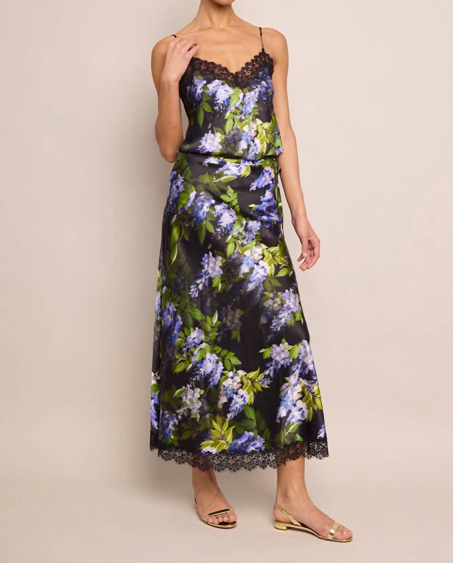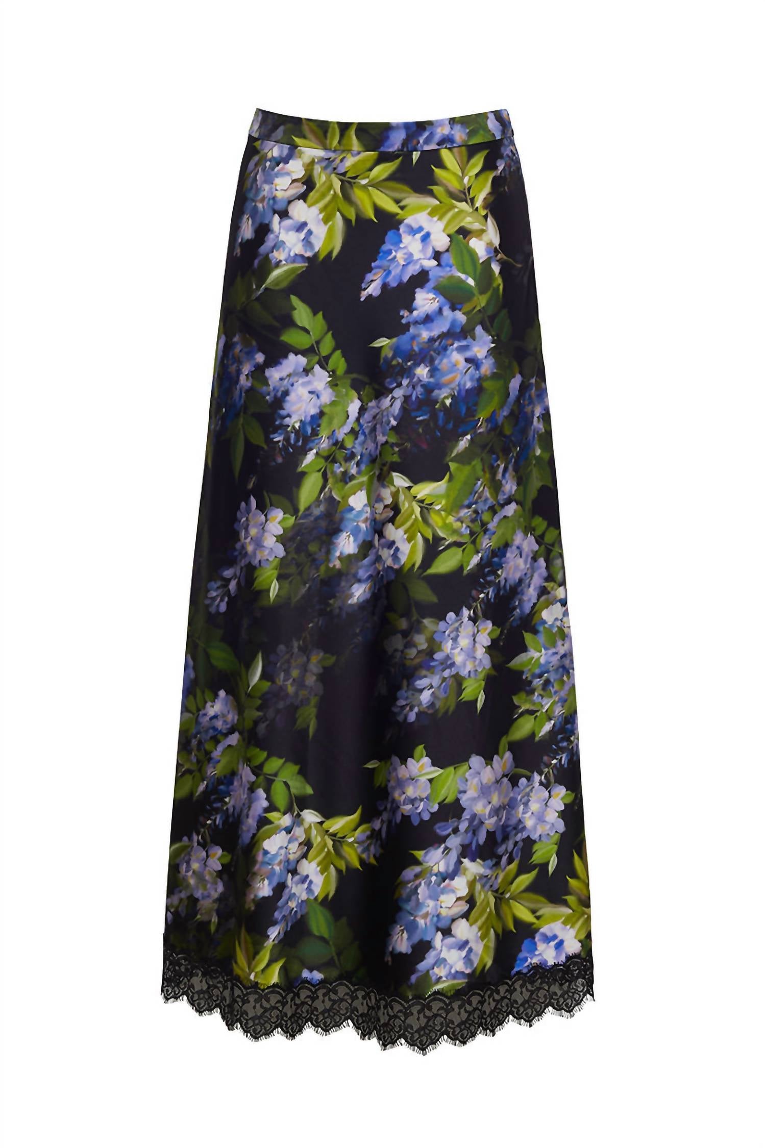Introducing the Cara Cara Kaia Slip Skirt, a perfect blend of elegance and style in a stunning Wisteria Black floral pattern. This midi-length skirt is cut on bias for a flattering fit and features a delicate lace insert at the hem. Crafted from a luxurious 92% Silk and 8% Spandex blend, it boasts a side zipper closure for a seamless look. Made in China, it requires dry cleaning or gentle cold hand washing to maintain its quality, ideal for those chic summer dinner parties.
