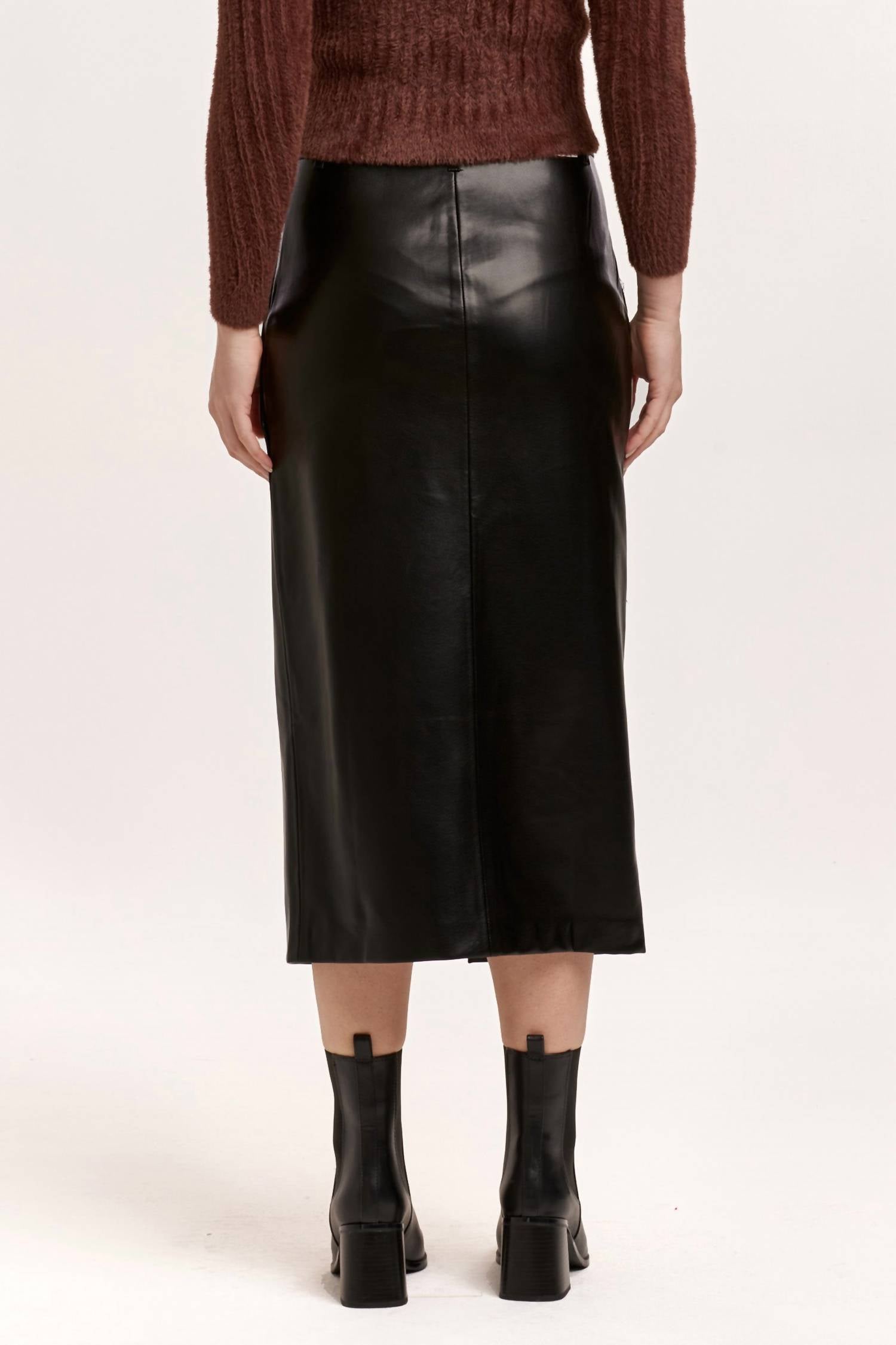 Discover the Sia Midi Skirt by DEAR JOHN DENIM, a ballerina length piece in sophisticated black vegan leather. Made from 100% Polyurethane, this skirt features a center front slit and side slant pockets, adding a touch of practical elegance. Closure is achieved with a zip and hook 'n' eye waistband, ensuring a sleek fit that sits slightly below the waist. Care for this statement piece by opting for dry clean only, perfect for spring dinner parties and holiday gatherings.