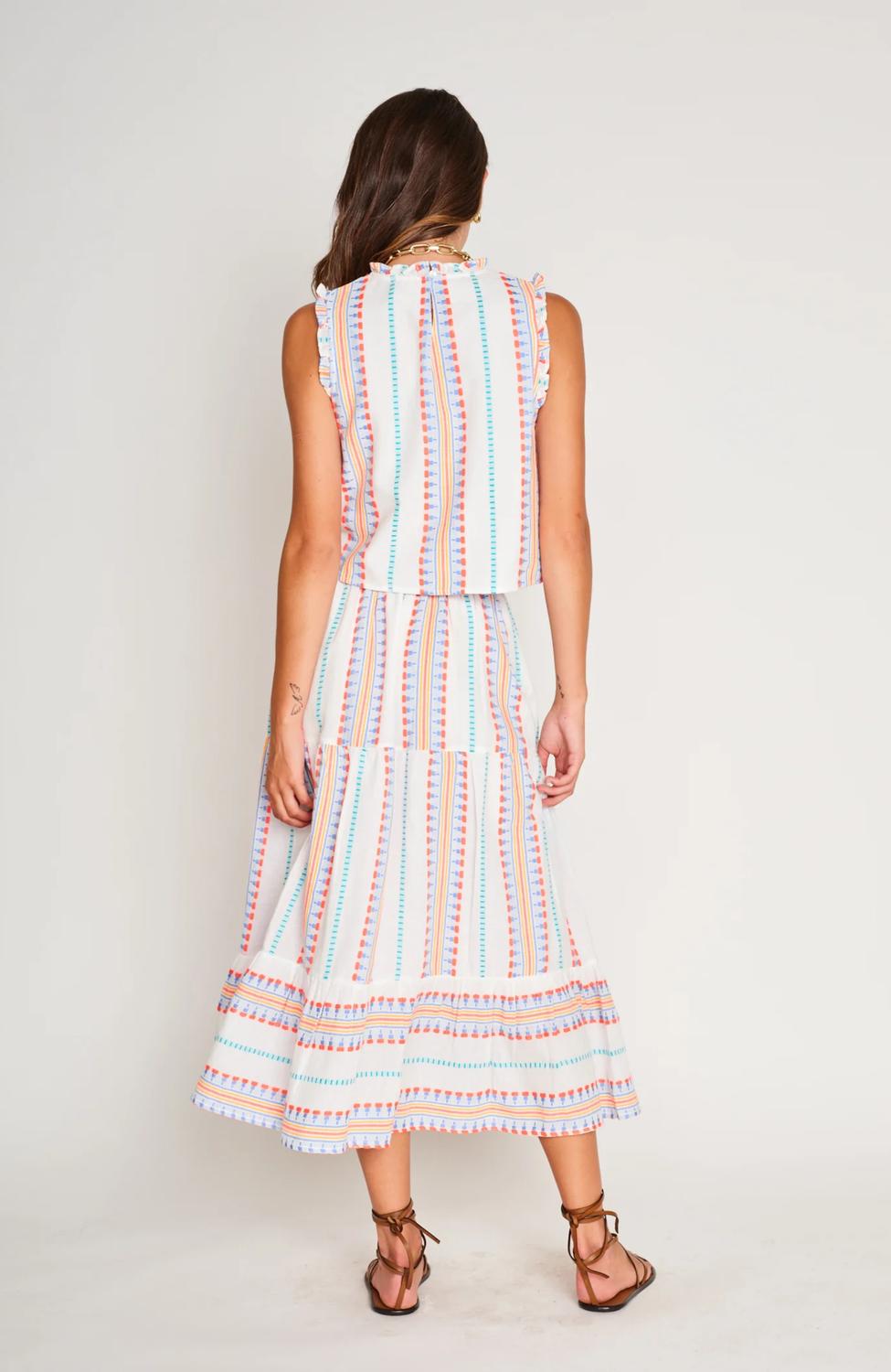 The midi length skirt is here to stay and we especially love this style. Introducing the Maya Skirt by dRA Los Angeles, crafted for those who love a chic and understated flair. This beautiful midi skirt features a tea-length cut with a soft pink and blue stripe pattern against a white background, showcasing contrast tiered details that fall elegantly just below the waist. With a convenient pull-on closure, it exudes effortless style, perfect for summer outings and holiday parties alike.