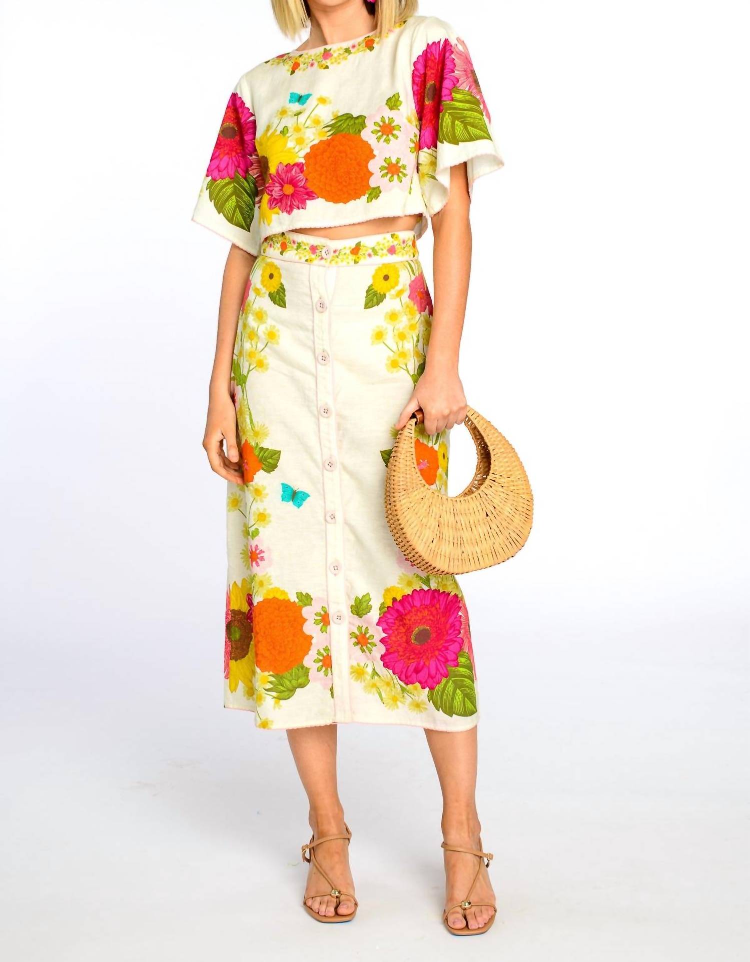 Meet the Frannie Button Front Printed Midi Skirt from ELIZABETH AND JAMES, a boho chic piece perfect for your spring wardrobe. Crafted from 100% linen, this elegant floral print skirt in Wildflower Ivory features a sophisticated button closure and white scalloped embroidery trim for added flair. With a versatile midi length, it seamlessly transitions from a matching set to a casual look with a simple tee. Care for this garment by hand washing and line drying to preserve its beauty.