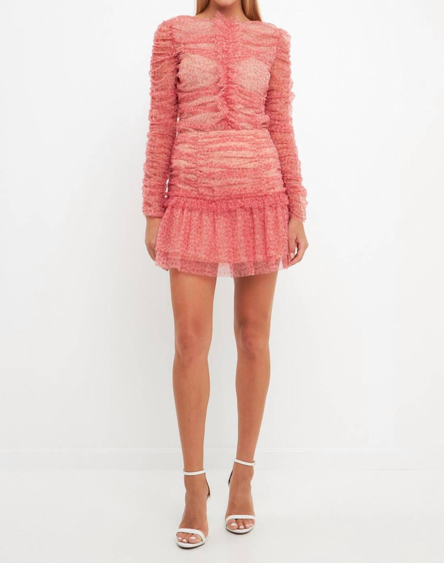 Tuck in your favorite tee for a more laid-back vibe. Make a statement with this mini-length shirred floral mesh skirt, perfect for stepping into the new season in style. Featuring a fitted silhouette and layered tulle at the hem, it brings playful movement and texture to your look. Adorned with bold floral prints, this skirt is a fresh departure from dull winter wear—florals are back, and this piece is sure to turn heads.