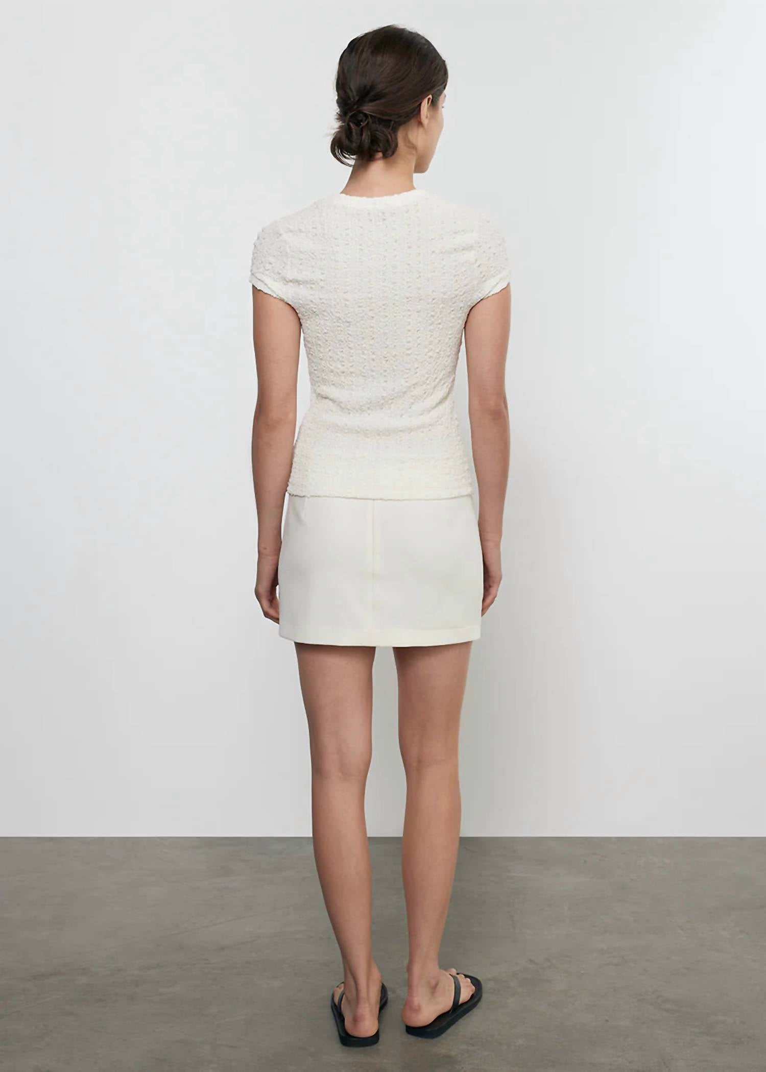 The Crepe City Mini Skirt by Enza Costa is crafted from softly structured pebbled crepe, blending 98% polyester and 2% Lycra for a comfortable fit that flatters the waist and hips. Made in the USA, this solid cream skirt embodies streetwear trends, perfect for a holiday party or Easter occasion. Closure: Side zipper. Care: Machine wash and tumble dry for effortless maintenance.