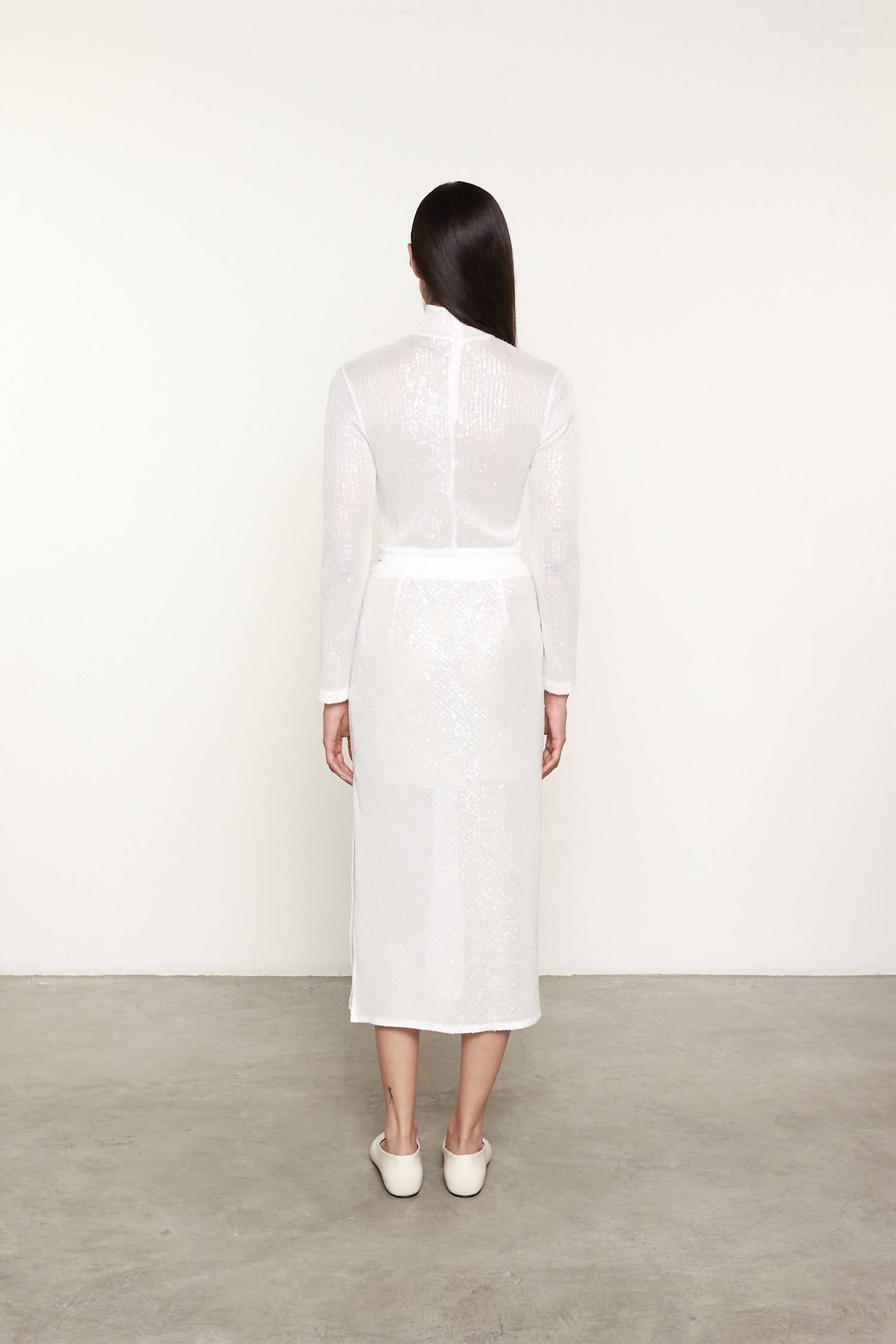 Show off just the right amount of skin in this beautifuly designed midi length skirt. Our sequin skirt features an all-over embellished design, elastic waistband, and side slit for ease. Pair this bias cut skirt with our sequin mockneck for a coordinated, occasion-ready look, or with any of our tissue cashmere tops.