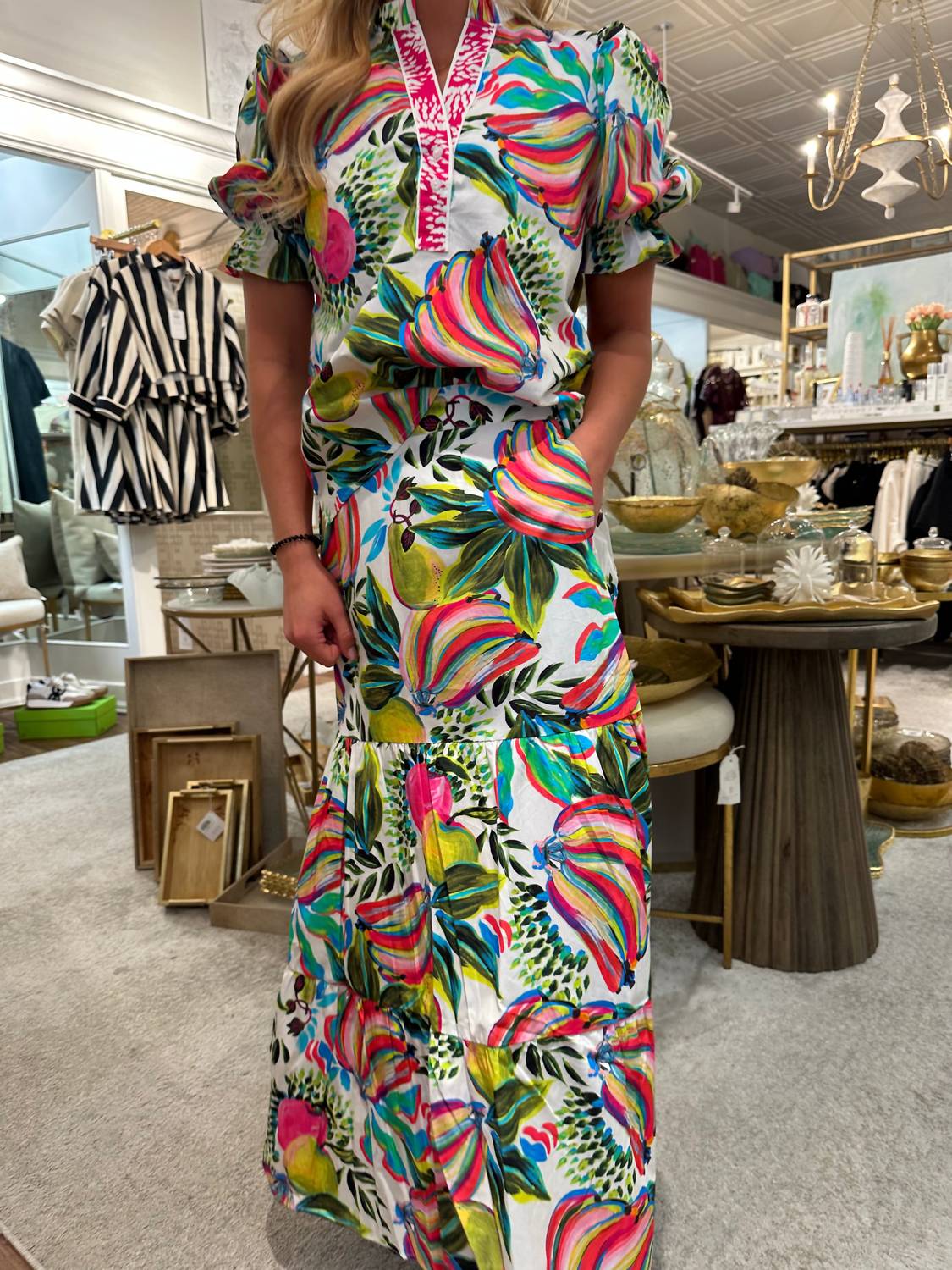 Elevate your wardrobe with the Ada Midi Skirt by Maude Vivante, featuring a vibrant Banana Pops pattern that's perfect for making a statement. Crafted from high-quality cotton, this women's skirt is designed for comfort with its lightweight and flowy fabric. As a versatile addition to your collection, it features convenient pockets and a pull on closure, seamlessly blending style with practicality. Ideal for a Thanksgiving holiday party, this skirt captures the essence of boho chic for the spring season.
