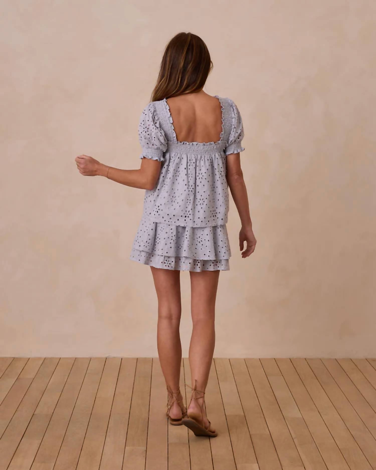The perfect mini skirt does exist. Introducing the Rylee & Cru Rose Mini Skirt, a playful addition to your summer wardrobe with its light blue hue and eyelet style. This skirt is made from 100% cotton, ensuring a comfortable and breathable fit. It features a flattering double-tiered design with a gathered waistline for a chic silhouette. Care is simple with machine wash cold and hang to dry instructions.