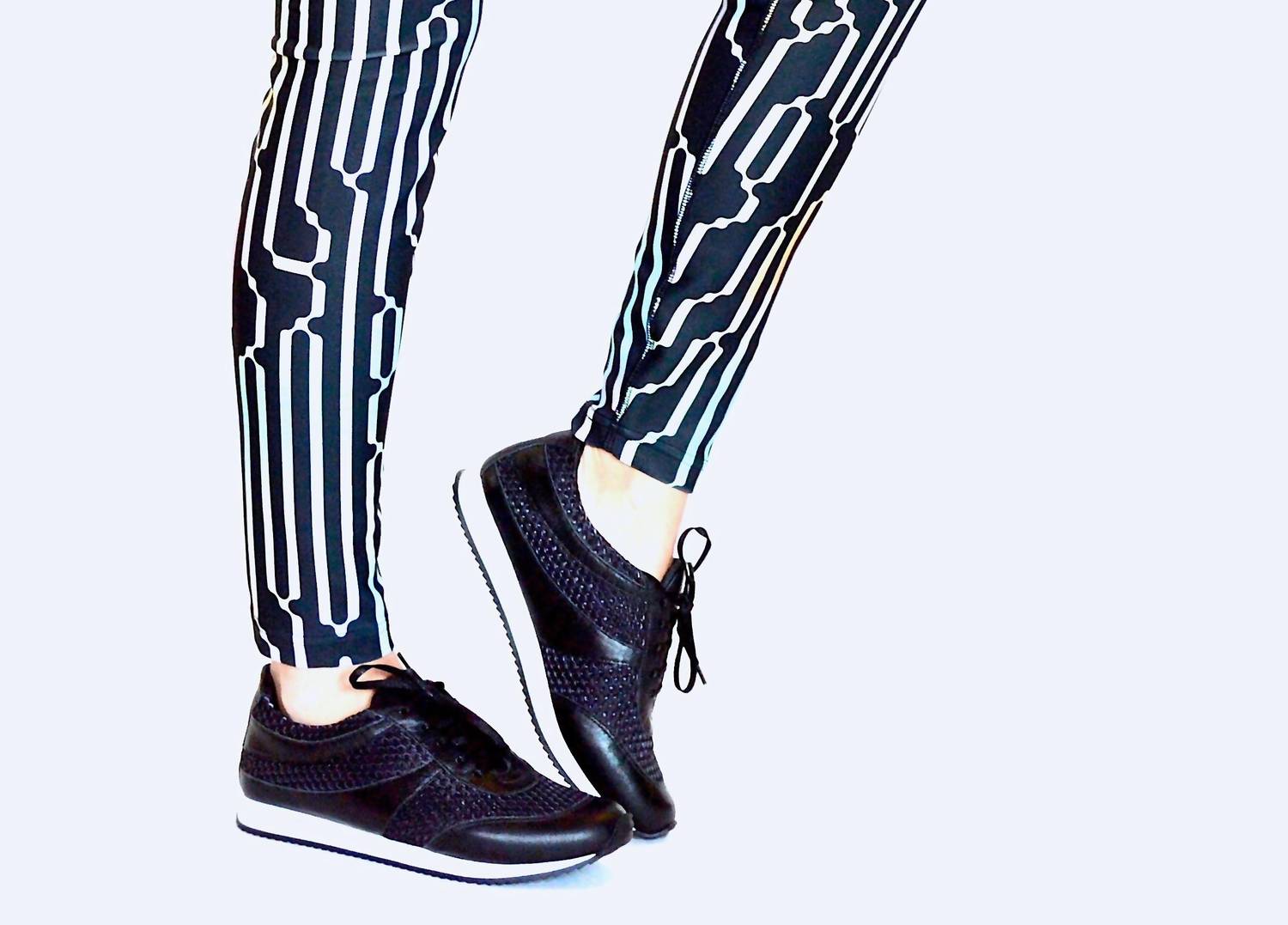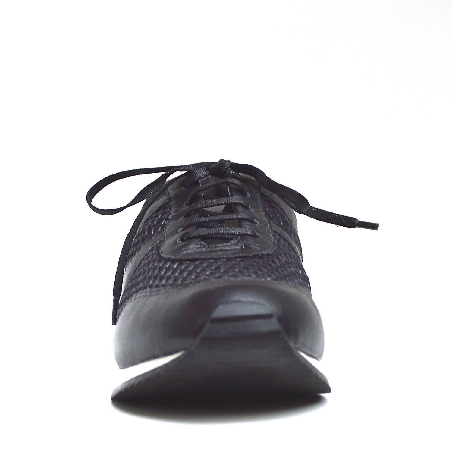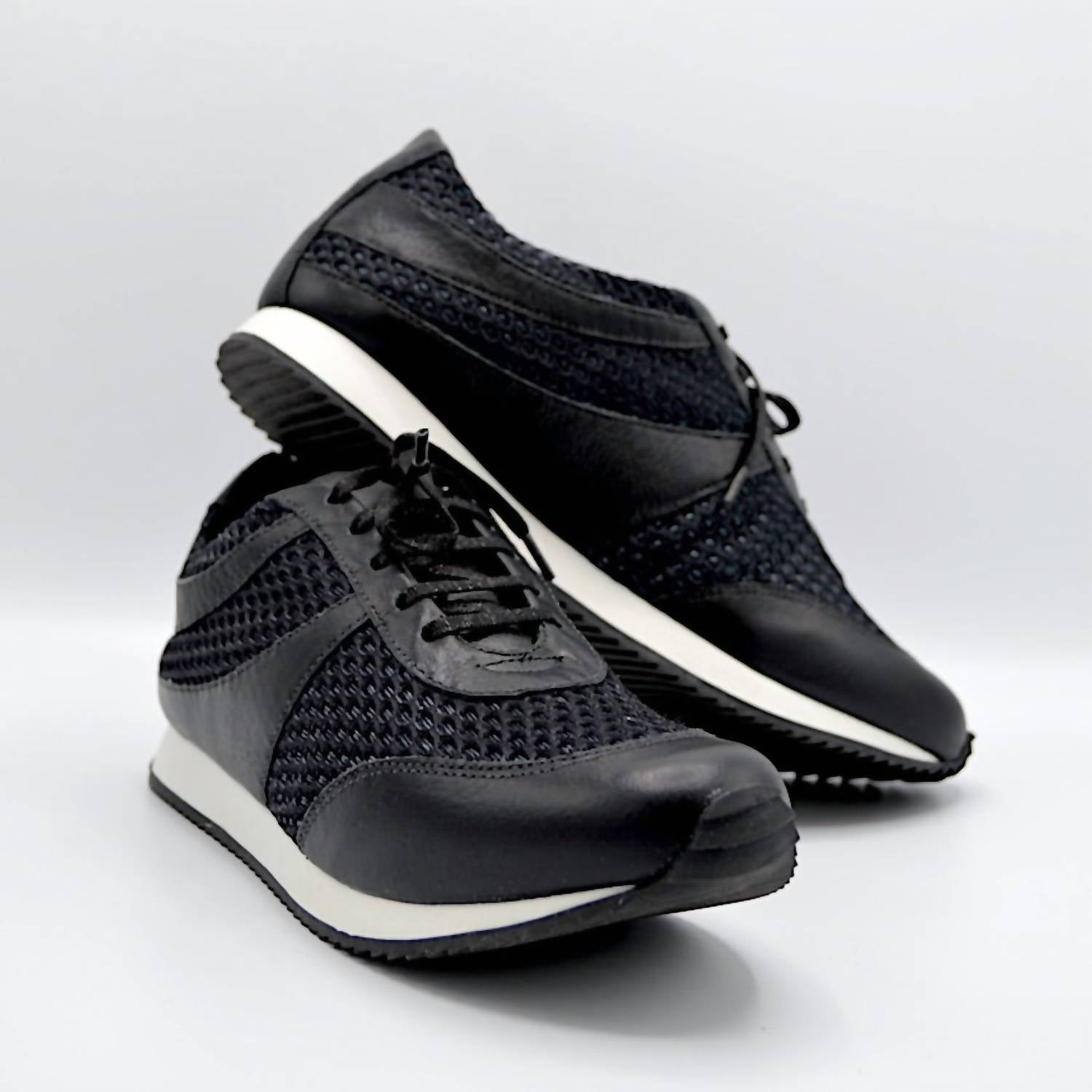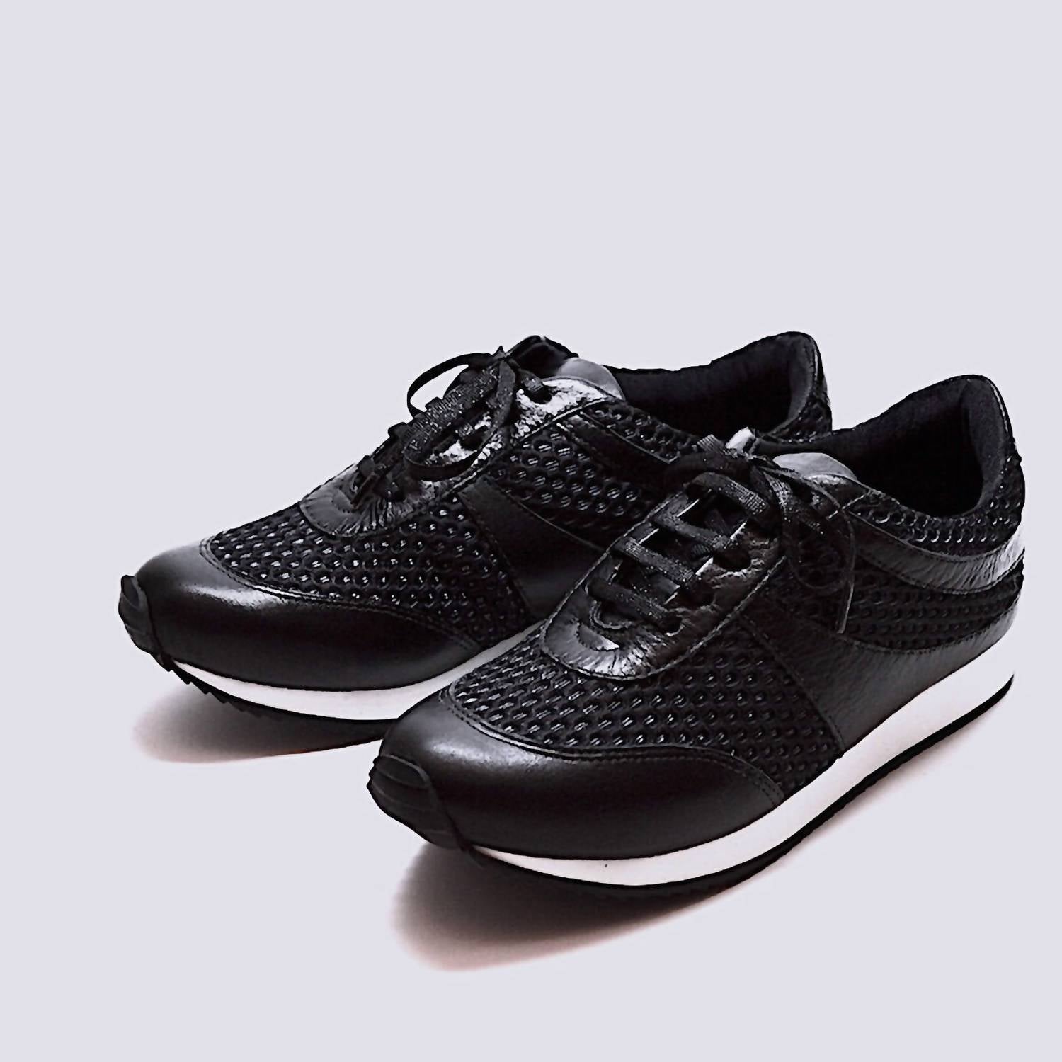 Chelsea Jones presents the Women's Train Walking Shoe, a chic blend of black leather and mesh perfect for athleisure enthusiasts. With a 1" platform, these sneakers are designed with traction rubber soles and flat sparkly laces for both style and functionality. Made in Brazil, the round toe design ensures comfort, ideal for summer fitness or casual occasions. Elevate your workout look with this trendy and functional footwear.