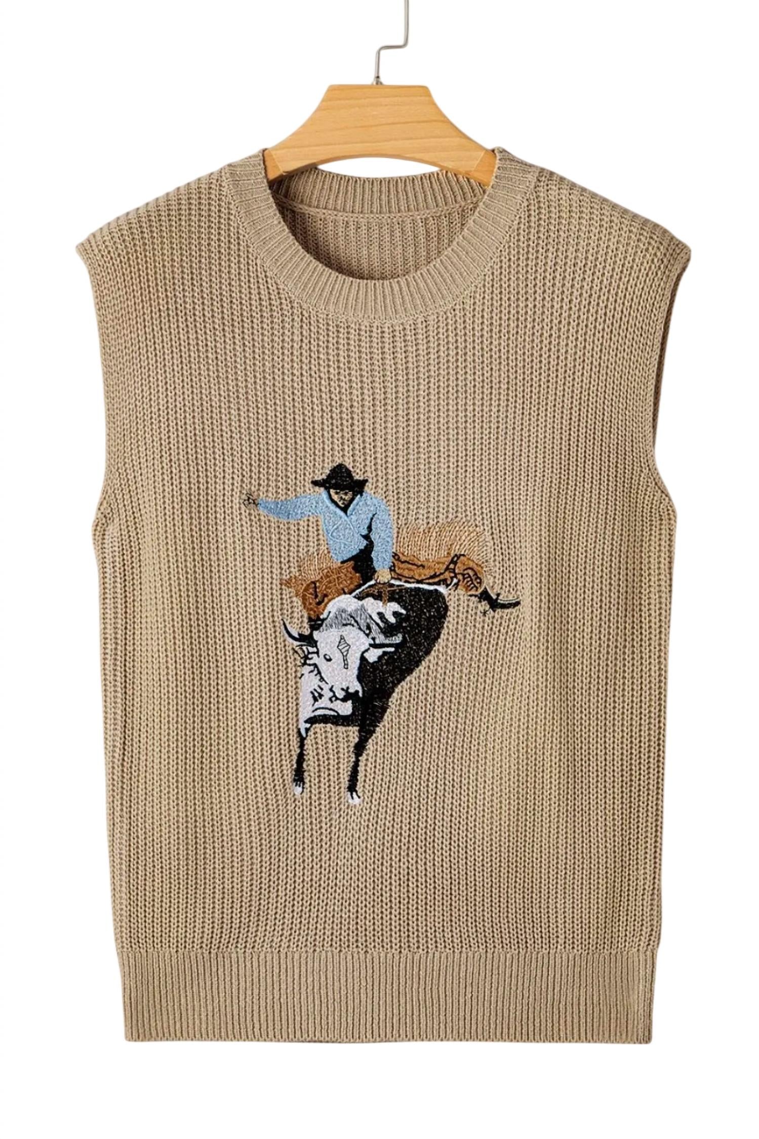 Experience the perfect blend of comfort and style with this trendy crew neck sweater, designed to effortlessly elevate your wardrobe. Pair it with your favorite denim and loafers for the perfect look. Introducing the Jackson Hole Knit Sweater Vest by 1 The Woman, a stylish choice in khaki for embracing Western charm. This sleeveless piece features playful embroidered cowboy graphics, perfect for adding a unique touch to your holiday party ensemble. Material: 100% Acrylic. Closure: Pull on.