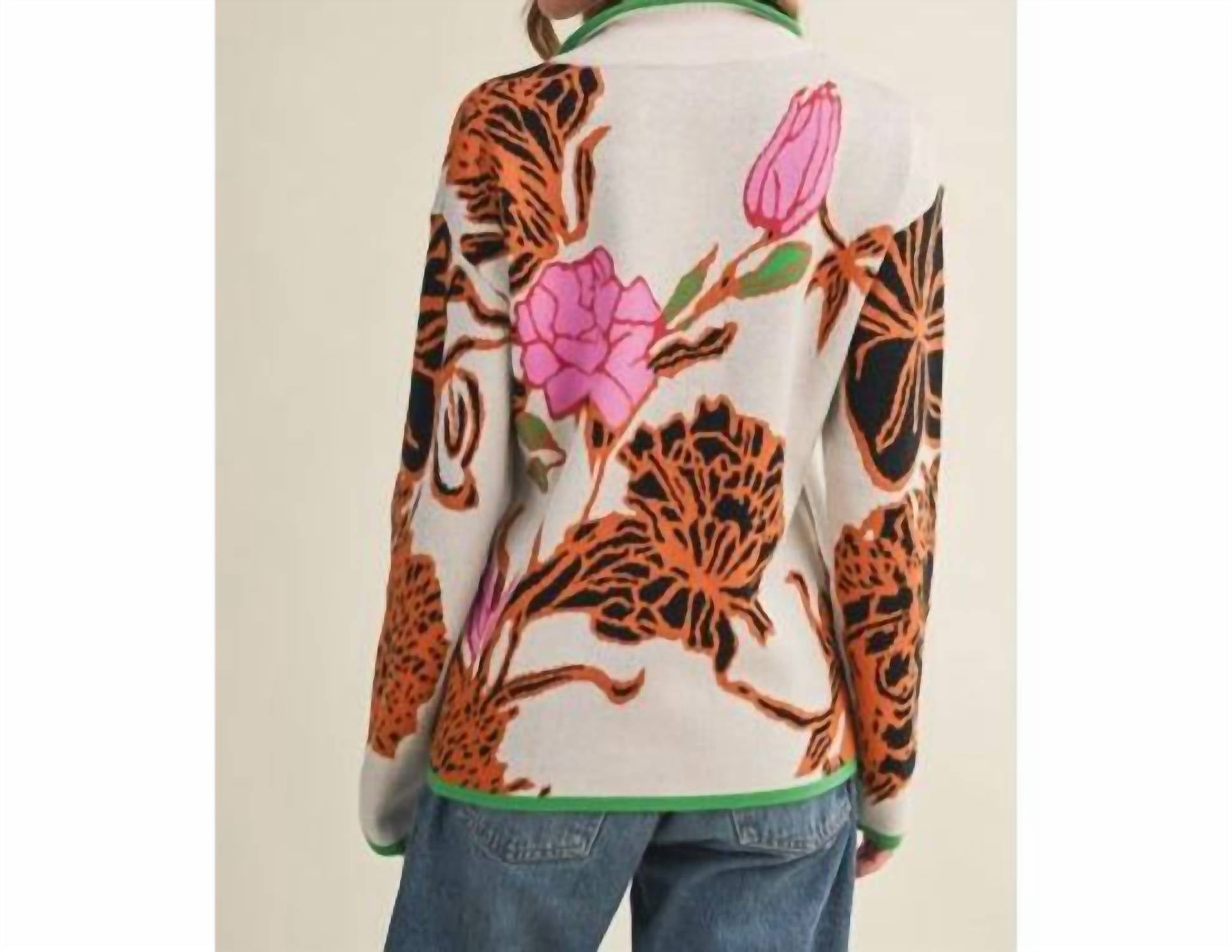 This cardigan will be a sweater-rotation favorite. Turn heads with the Aapparella Half-Zip Long Sleeve Sweater, a perfect blend of style and comfort. This women's cardigan features long sleeves and a vibrant floral pattern in bold orange and pink blooms against a soft cream background, crafted from a luxurious viscose blend. The mockneck design and relaxed fit add a cozy touch, finished with a chic zip closure. Care for this piece by hand washing and laying flat to dry to maintain its vibrant appearance. Available sizes: S (38.6" bust, 24" sleeve length), M (40.9" bust, 24.8" sleeve length), L (43.3" bust, 25.6" sleeve length), XL (46.5" bust, 26.4" sleeve length).