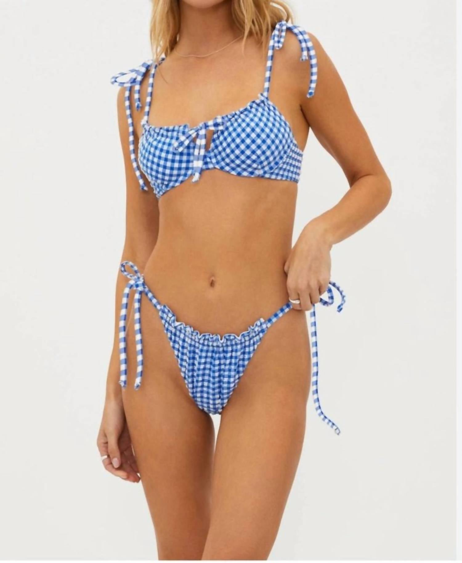 Dream of your next beach getaway in this cute little number. Pair with strappy sandals, a floppy hat, and an oversized tote to complete the perfect vacation look. Introducing the Caitlin And Cara Bikini Set by Beach Riot, a chic swimwear favorite in Seaside Gingham. This swim set features a bralette top crafted from 60% polyester, 36% polyamide, and 4% elastane. The top is equipped with adjustable shoulder strap closures and a back hook closure, while the string bikini bottom boasts a tie closure on the sides. Top made in China and bottom made in the USA. Hand wash only. Perfect for a stylish beach day with cheeky coverage.