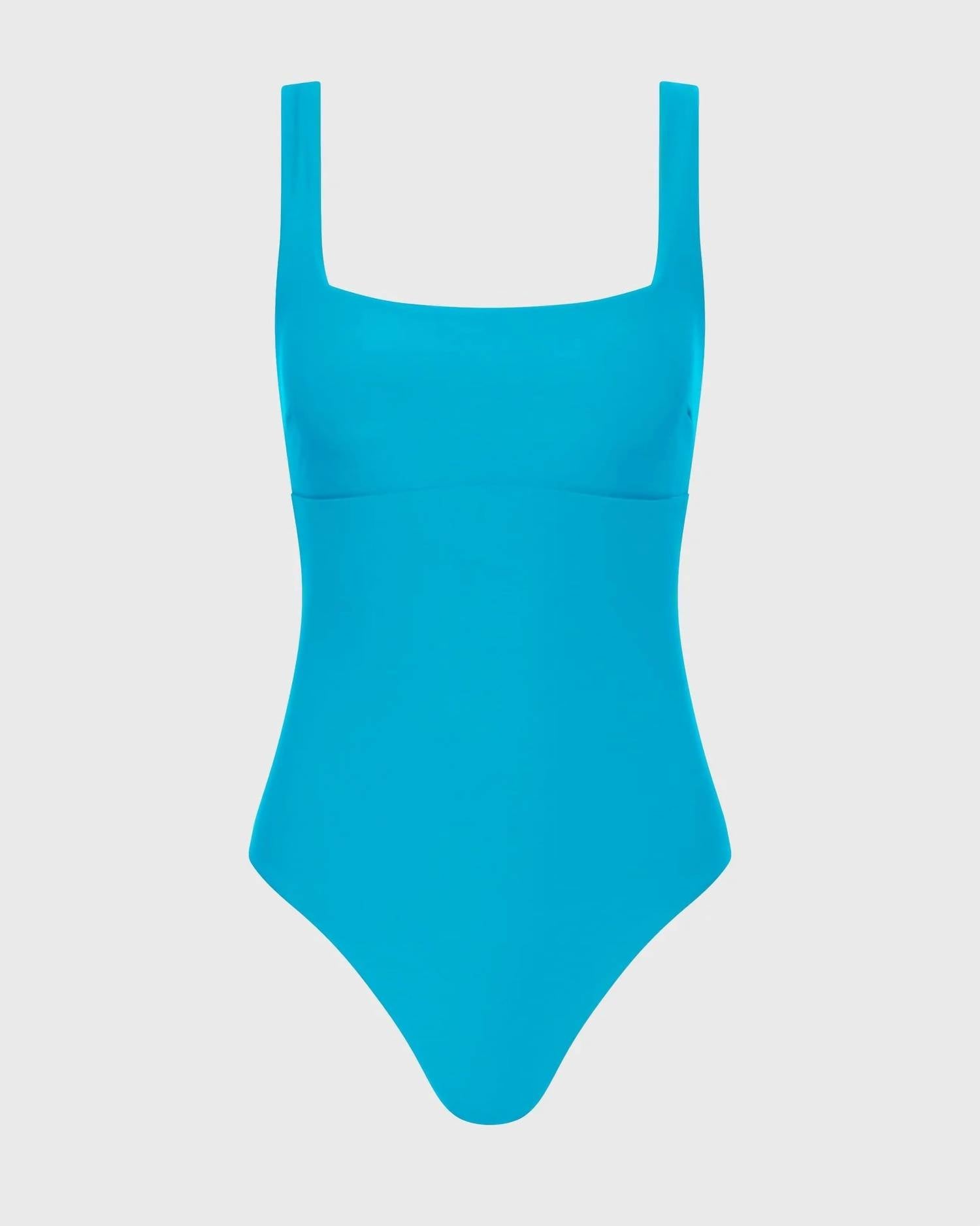 Discover the Maika One Piece Swimsuit by BONDI BORN, an elegant beach day essential in a vibrant Caribbean hue. This swimsuit, designed with a classic square neckline and supportive features like a bra panel, invisible under-bust support, and removable bra cups, offers comfort and style for most bust sizes from A to DD. Made from luxurious, sustainably sourced polyester fabric from Italy, it combines fashion with eco-friendliness. Care: Hand wash only.