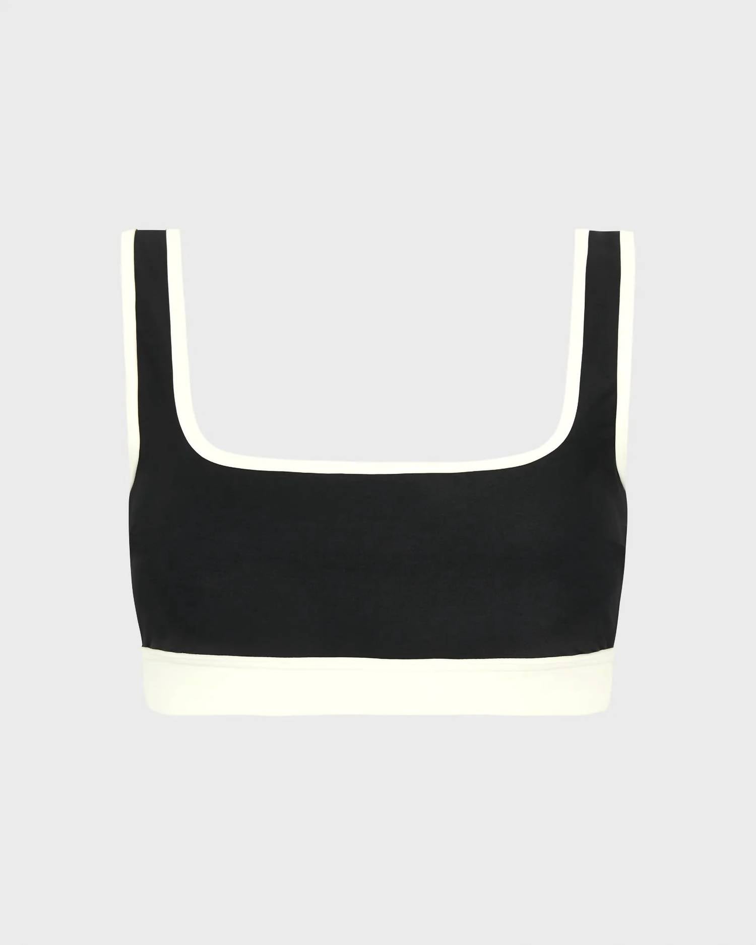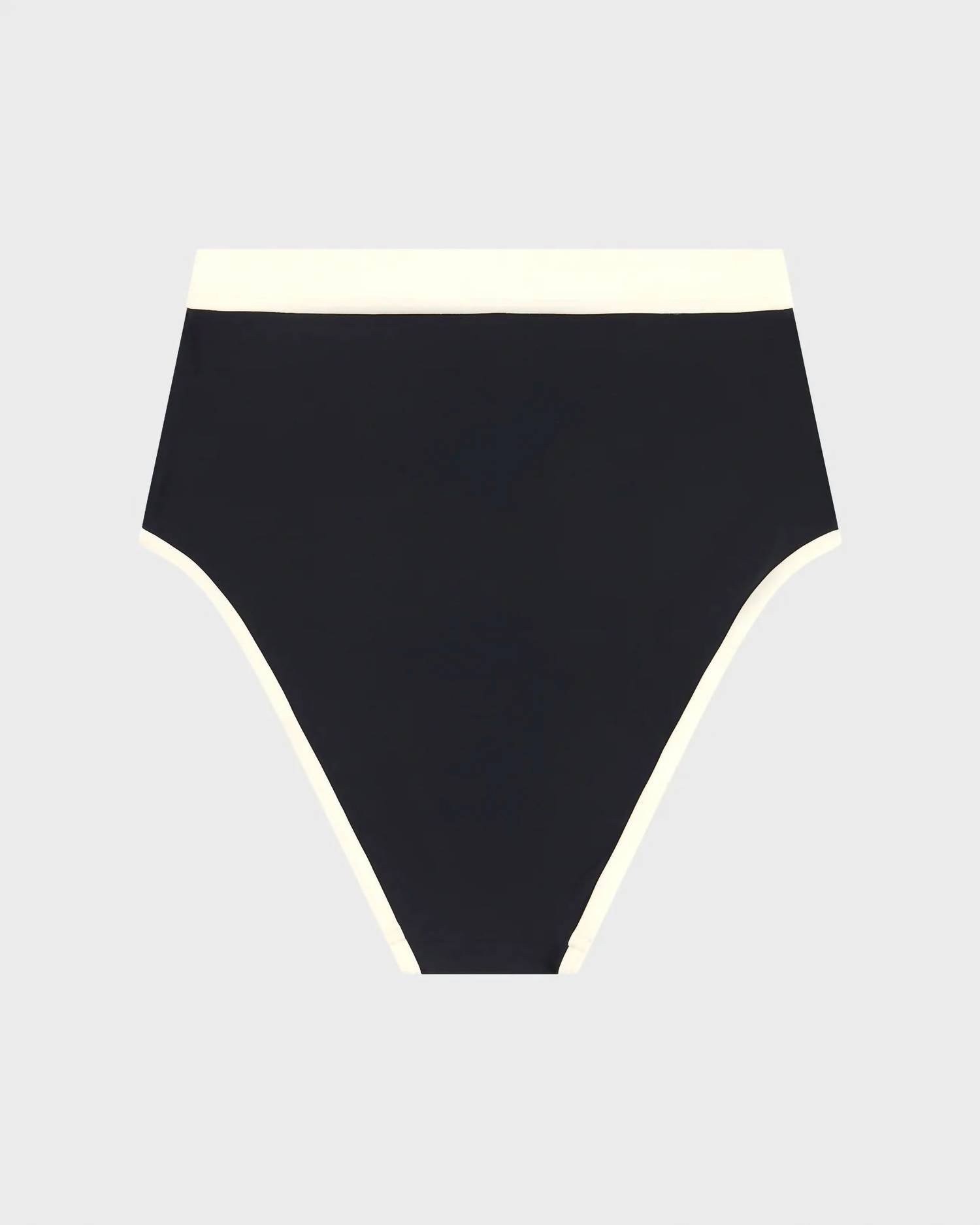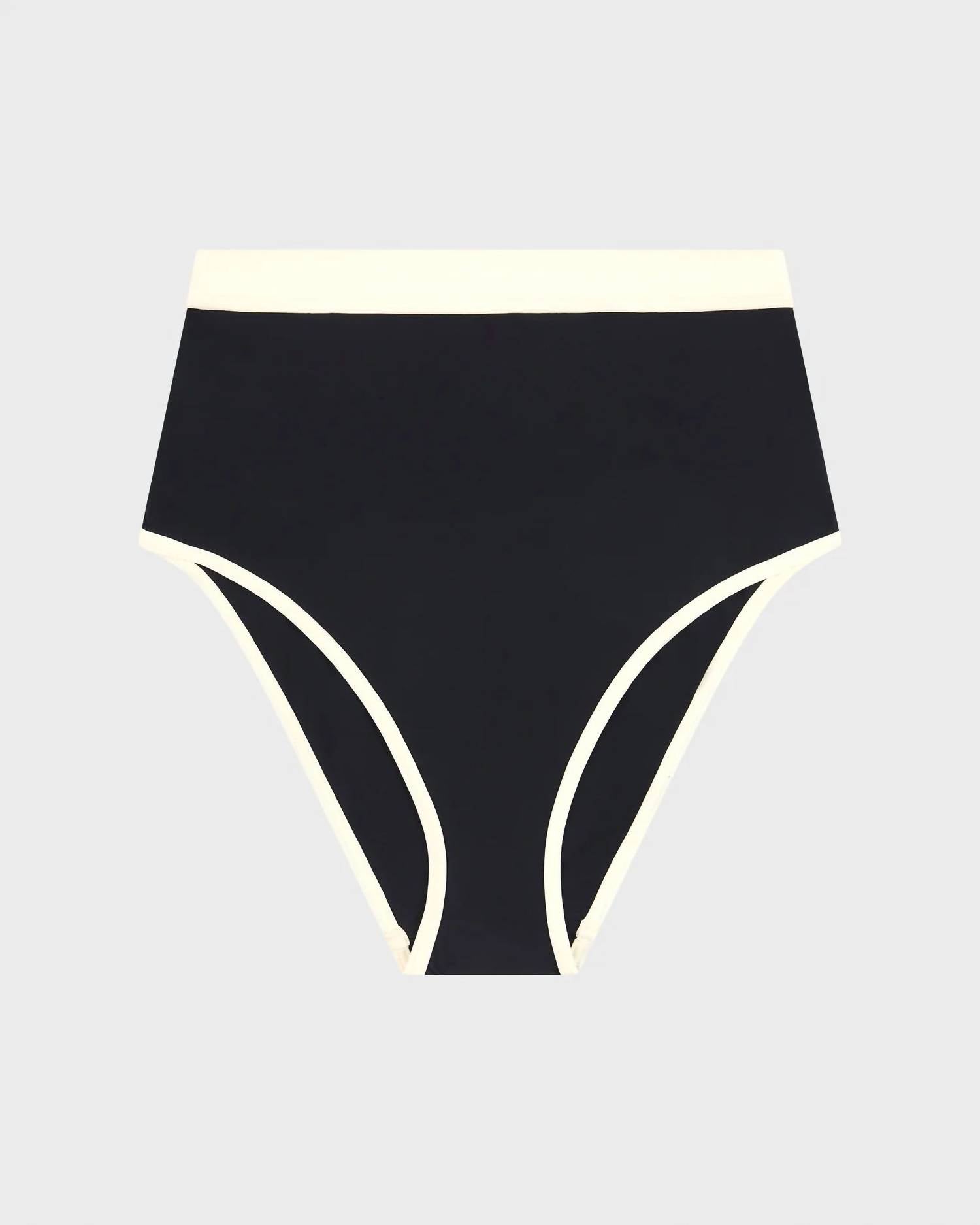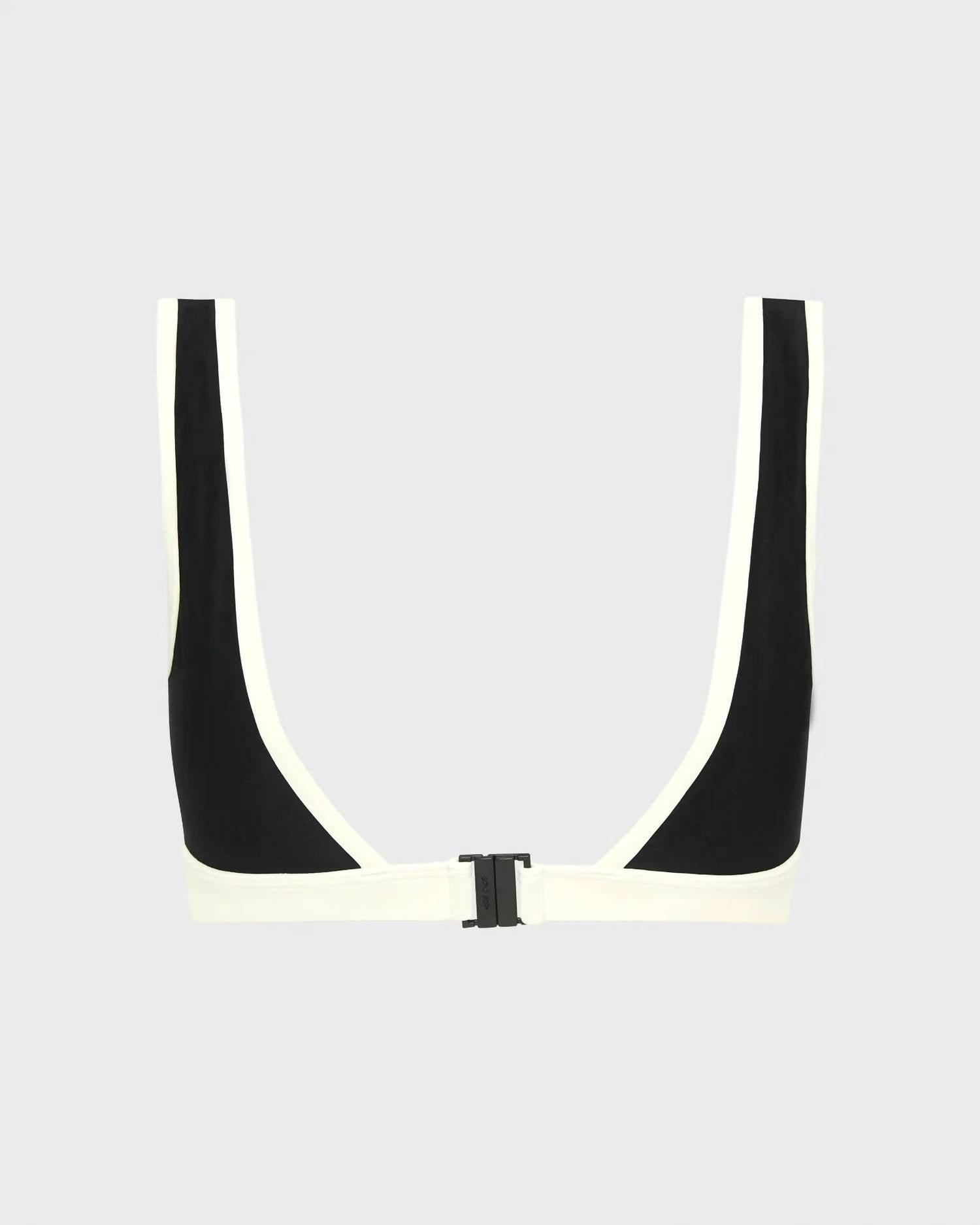 Introducing the BONDI BORN Two-piece Hayden and Jayde Bikini Set in a sophisticated black and white colorway. Crafted from advanced Sculpteur® fabric, this set includes a square neck bandeau top with invisible under-bust support and a branded clip back closure. The high-waist bikini bottom features a contrasting pearl waistband for a flattering and supportive fit. Material: Nylon. Ideal for a stylish beach day and perfect for spring. Care: Hand wash.