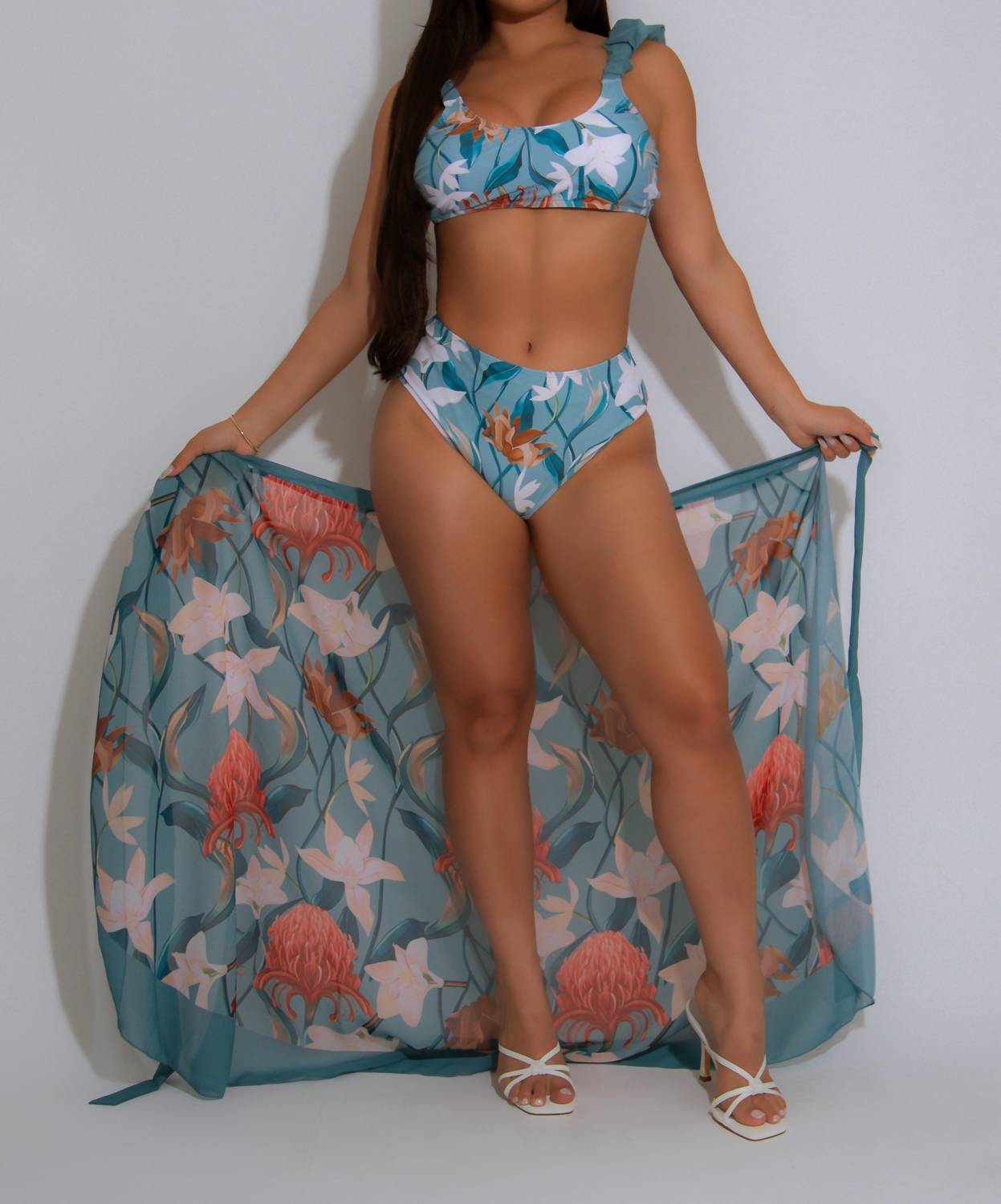 Ideal for relaxed poolside moments, this adorable swimsuit effortlessly transitions into the perfect sunset dinner outfit when paired with a flowing skirt. Unveil your inner diva with the Island Bloom Floral Bikini Set by Diva, a striking swimwear choice in vibrant blue. This set features an adjustable tie ruched-strap bralette top with a charming tie-front detail, paired with high-waisted floral bikini bottoms for a flattering high-rise fit. Meticulously crafted from a flexible blend of 82% Polyester and 18% Spandex, this swim set promises both comfort and style. Care instructions include machine wash and line dry, ensuring easy maintenance for your summer beach days.