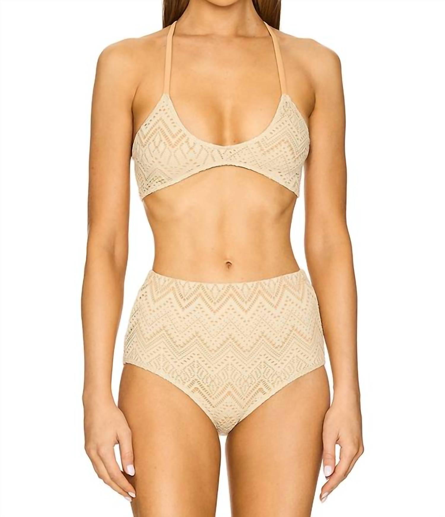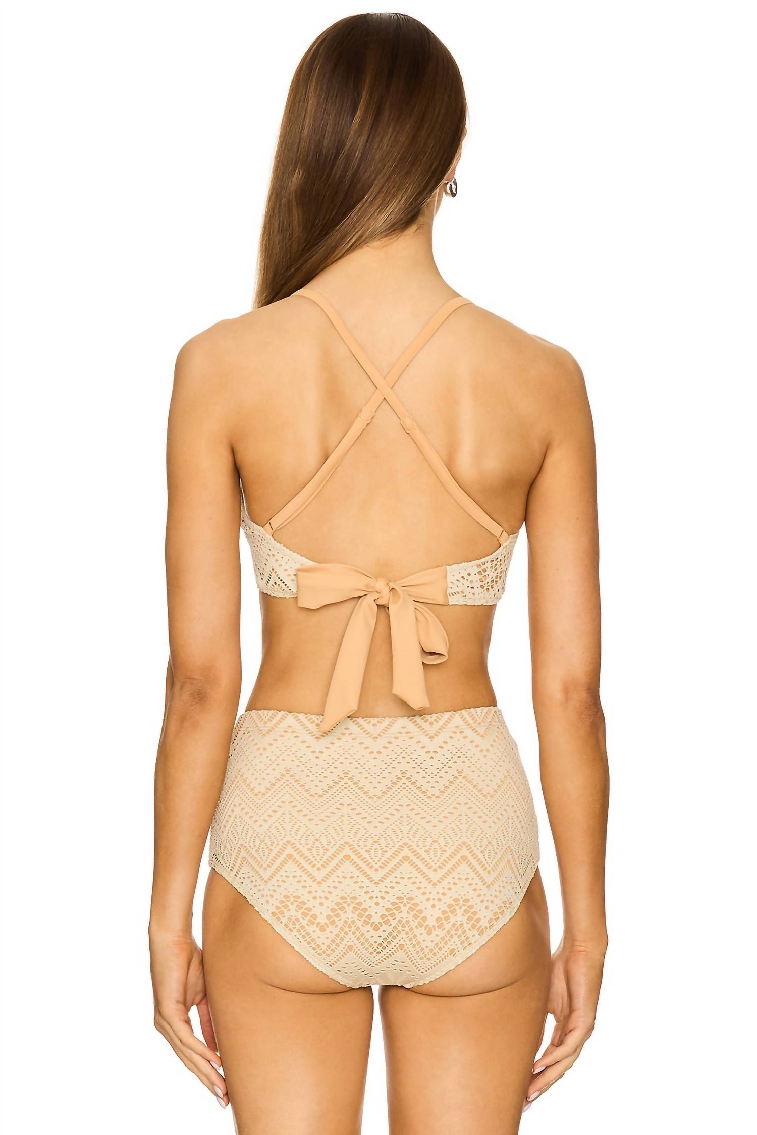Ideal for relaxed poolside moments, this adorable swimsuit effortlessly transitions into the perfect sunset dinner outfit when paired with a flowing skirt. Experience the Crochet Misty Crop Bikini Top by Free People, a standout piece from their free-est Swim collection. This sand-colored swim top offers an adjustable fit with a scoop neckline and self-tying back closure. Crafted from 97% Polyester and 3% Elastane, it features a soft, textured crochet-inspired design. Care: Hand wash. Perfect for a classic beach day, this bralette style is a sleek addition to any summer wardrobe.