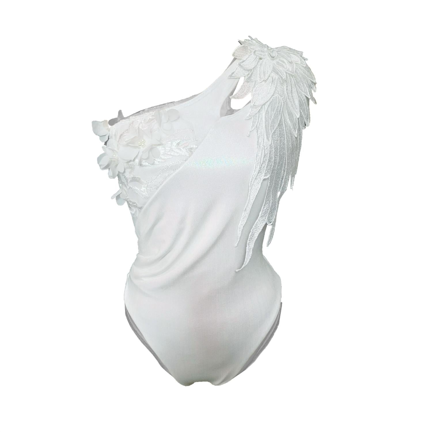 This one piece fits like a glove and covers all the right areas. Introducing the Countess One-Piece by Gyv Me Body, a luxurious bathing suit in elegant ivory that captures timeless allure. This opulent piece is crafted from Lycra spandex, featuring a one-shoulder design with a double strap and exquisite asymmetric pleating. Adorned with delicate 3-D pearl flowers and a detachable feather detail, it transitions seamlessly from poolside to evening sophistication. Hand wash, lay flat to dry.