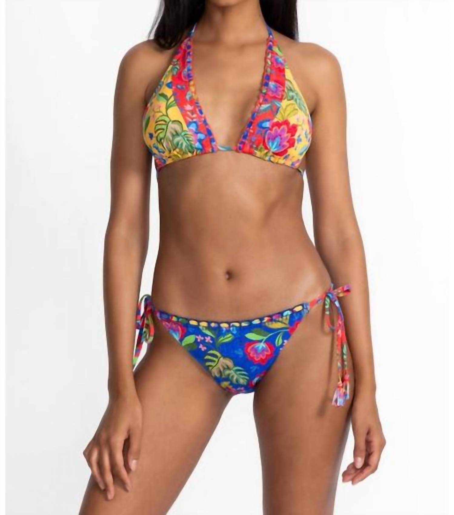 Dream of your next beach getaway in this cute little number. Pair with strappy sandals, a floppy hat, and an oversized tote to complete the perfect vacation look. The string bikini top is adorned with fresh flowers, creating a bold fusion of color and pattern. Designed with fully lined removable cups, this stylish bikini top ties with spaghetti straps at the neck and back and is finished with a decorative whipstitch detail at the front. Pair it with the string bikini bottoms for a perfectly coordinated poolside look. The model is 5'10 1/2" and wearing a size S.