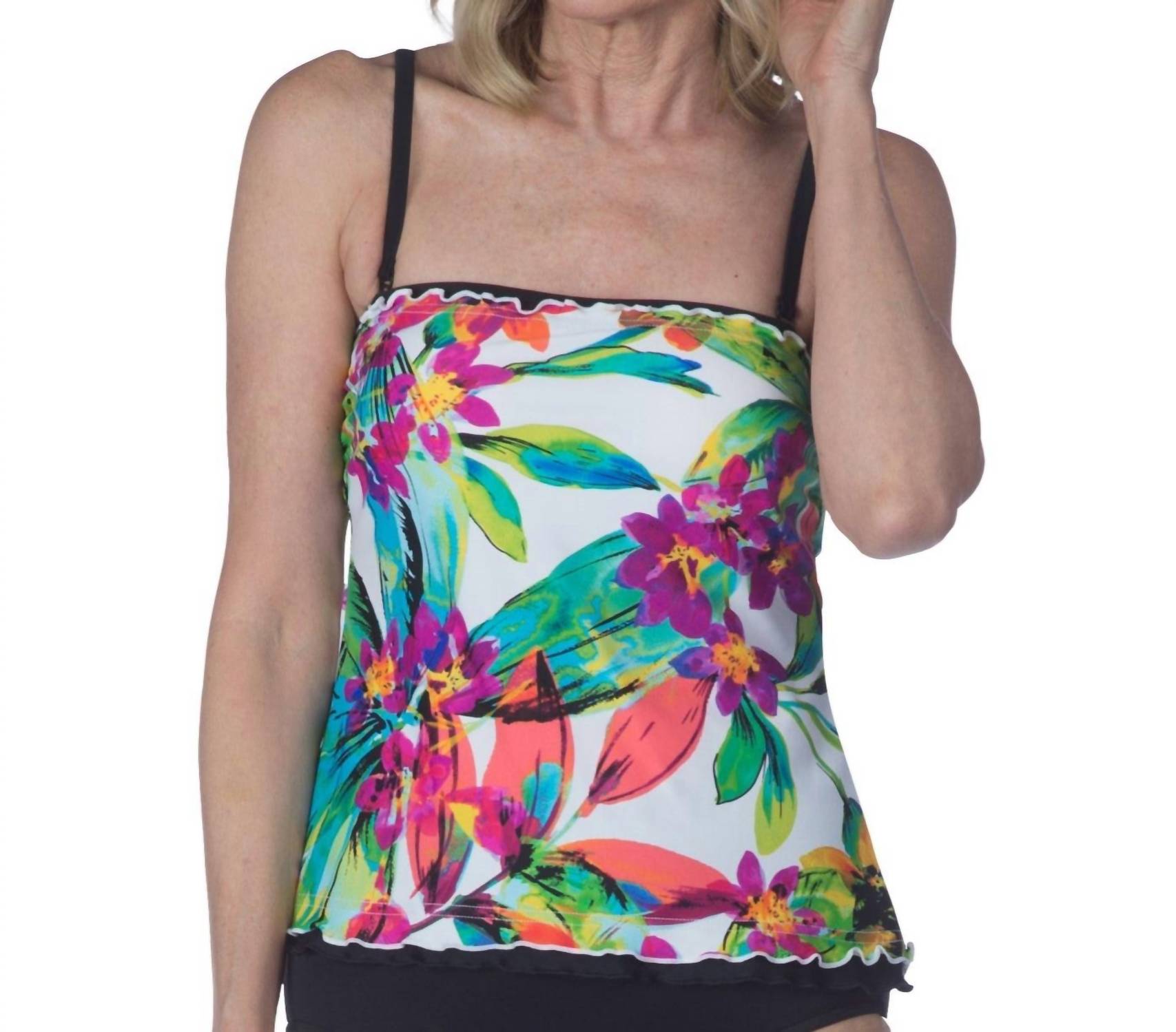 Ideal for relaxed poolside moments, this adorable swimsuit effortlessly transitions into the perfect sunset dinner outfit when paired with a flowing skirt. Elevate your beach day attire with the Ruffled Tankini Top by Maxine of Hollywood in the charming Max Summer Bounty hue. This women's swim top features a bandeau neckline to accentuate the bust, complemented by a visually slimming ruffled hemline. Offering full coverage and crafted from an 82% Nylon, 18% Elastane blend, it includes soft molded cups with adjustable, removable lingerie straps for customizable comfort. Care instructions dictate hand wash and line dry, ensuring lasting wear through the summer season.