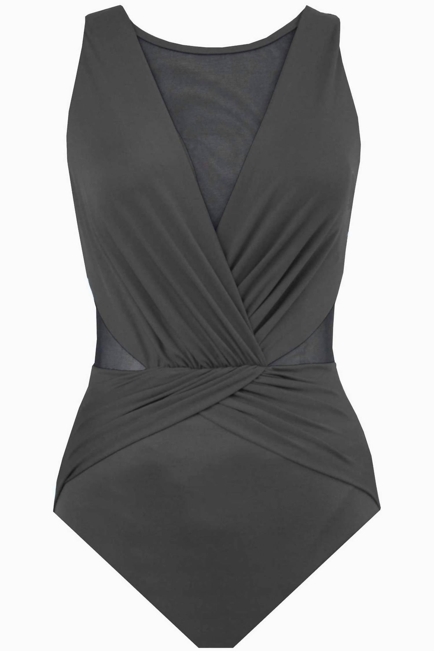 This one piece fits like a glove and covers all the right areas. The Miraclesuit Illusionists Palma One Piece Swimsuit in black is crafted to impress with its full coverage and slimming silhouette. Featuring fixed shoulder straps and a high neckline, this swimsuit is designed with mesh insets for a streamlined hourglass effect and is perfect for a chic beach day. Made from a durable nylon blend, this suit incorporates LYCRA® XTRA LIFE™ Spandex, offering a long-lasting fit. Care instructions include hand washing in cool water and line drying to maintain its quality. Model is 5'10" and wears size 8.