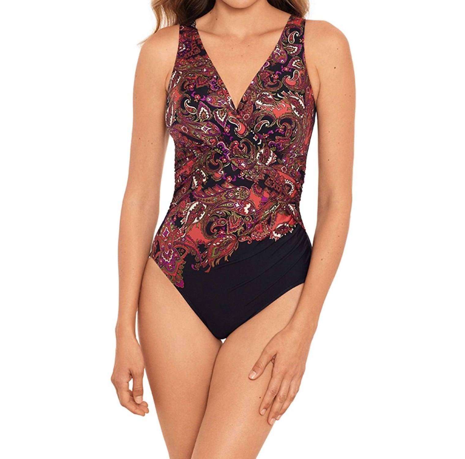 This one piece fits like a glove and covers all the right areas. This Swimsuit features a miratex fabric provides allover body control, shapes and slims, soft cup, cleverly draped fabric conceals tummy. Hand wash in cool water. Use non chlorine bleach. Line dry. Do not iron. 69% nylon, 31% spandex. Look 10 lbs. Lighter in 10 seconds.