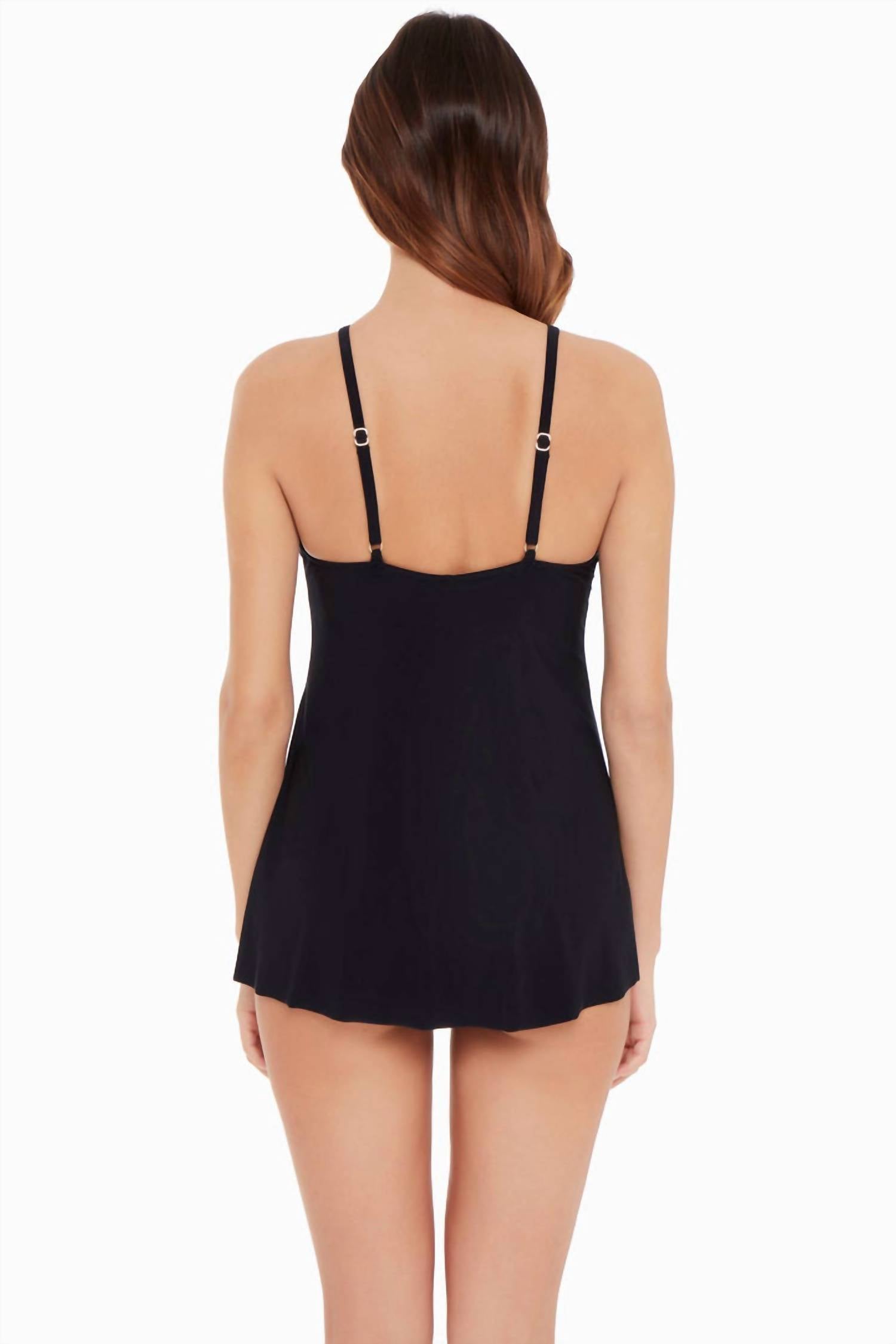 Ideal for relaxed poolside moments, this adorable swimsuit effortlessly transitions into the perfect sunset dinner outfit when paired with a flowing skirt. The Miraclesuit Parker Swim Dress in classic black promises a flattering fit with its adjustable straps and high neckline, while the underwire bra support and removable soft cup padding ensure comfort and support. Its design includes a skirted leg cut, full straight back, and optional side tie feature for customizable bottom coverage. Made from 69% Nylon and 31% LYCRA® Spandex, this tankini-style swim top offers allover slimming control. Care: Hand wash in cool, clear water and hang to dry; avoid chlorine bleach, ironing, and tumble drying for long-lasting wear.
