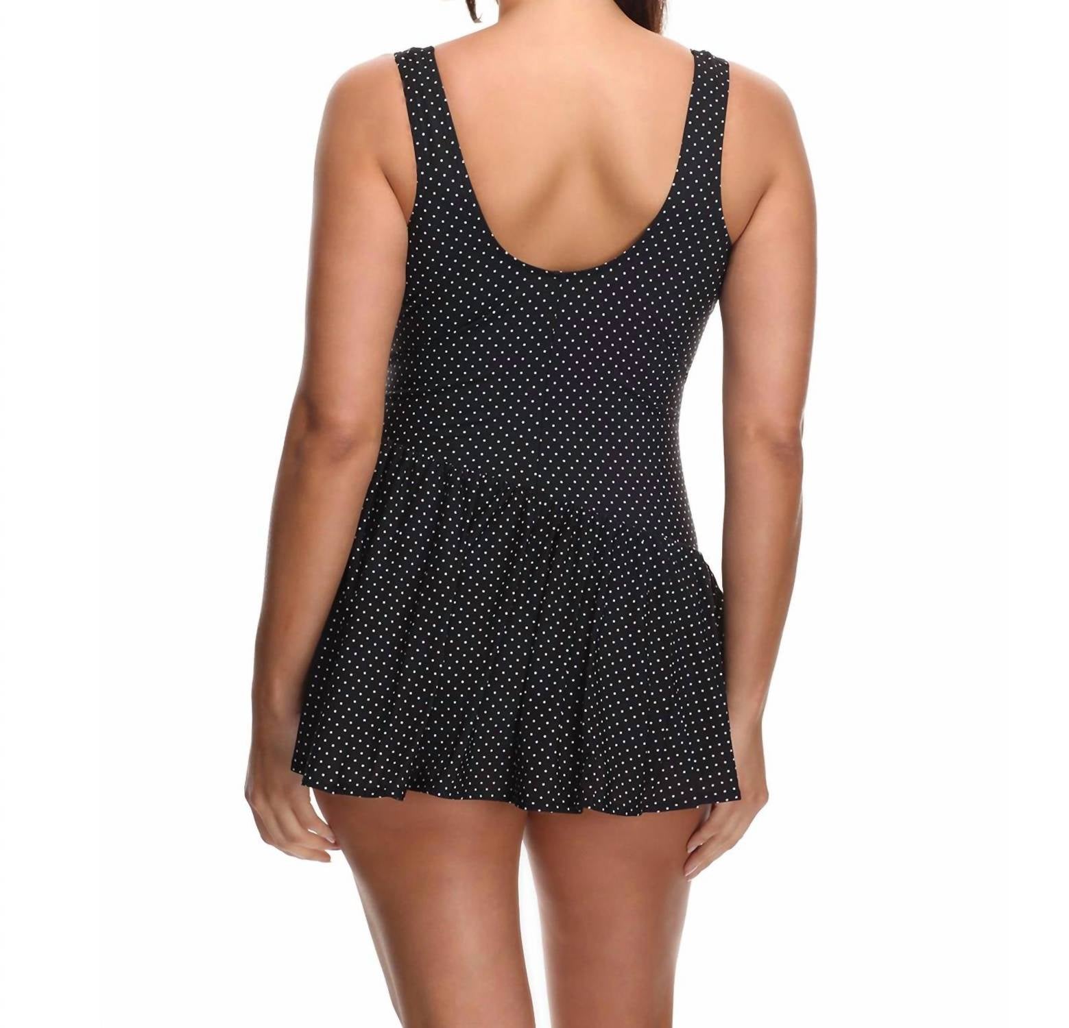A one piece so chic you could even wear it as a bodysuit with your favorite pair of jeans. Introducing the Pin Point Aurora Underwire Swimdress by Miraclesuit, a stylish swimwear option designed to flatter and support. This plus-size swimdress in a chic black and white polka dot pattern features a surplice V-neckline and shirred crossover bodice, enhancing the bust while slimming the torso. Made from a blend of 69% Nylon and 31% Lycra Spandex, it offers a soft molded cup bra for comfort and coverage, cleverly hiding hips, rear, and thighs. Care: Hand wash and line dry. Perfect for a beach day, this swimdress captures Y2k trends with classic coverage.