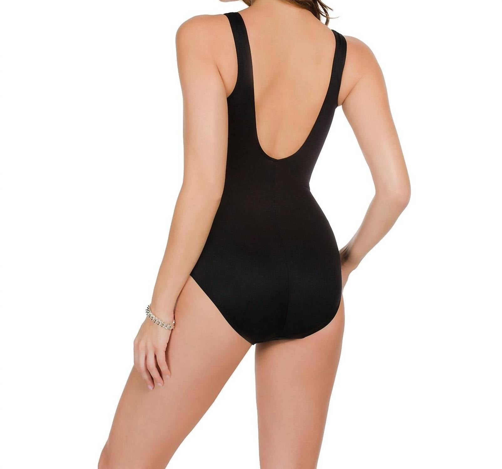 A one piece so chic you could even wear it as a bodysuit with your favorite pair of jeans. Experience beach day confidence with the Miraclesuit Sound Wave Temptress One Piece Swimsuit in a chic black and white tie-dye pattern. This swimsuit, crafted from a 69% Nylon and 31% Lycra Spandex blend, features a V-neckline with a scoop back and moderate leg for a flattering fit. Its side shirred bodice and soft molded cup bra are designed to visually slim the torso and accentuate the bust. Care instructions: Hand wash and line dry for long-lasting wear.