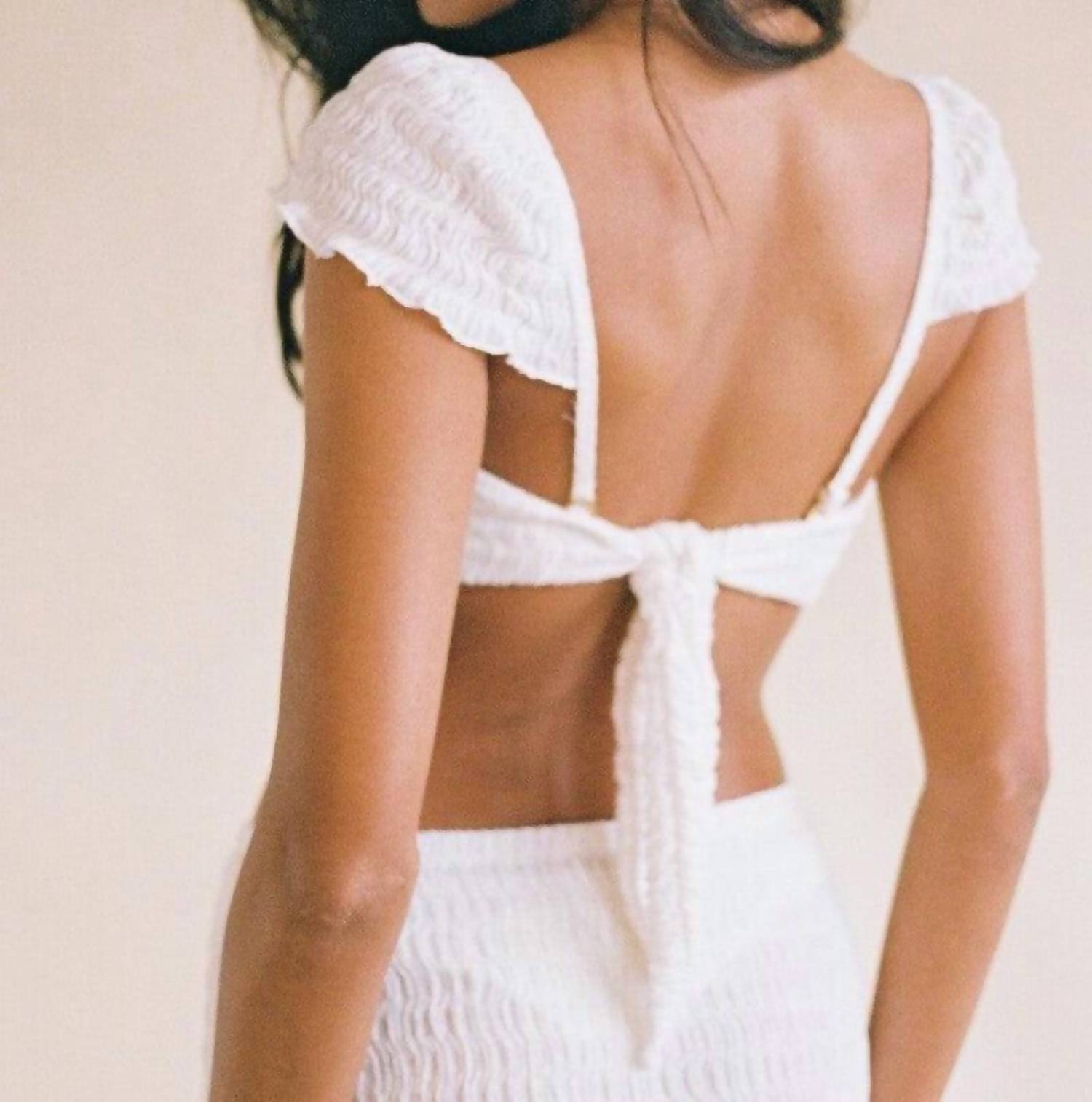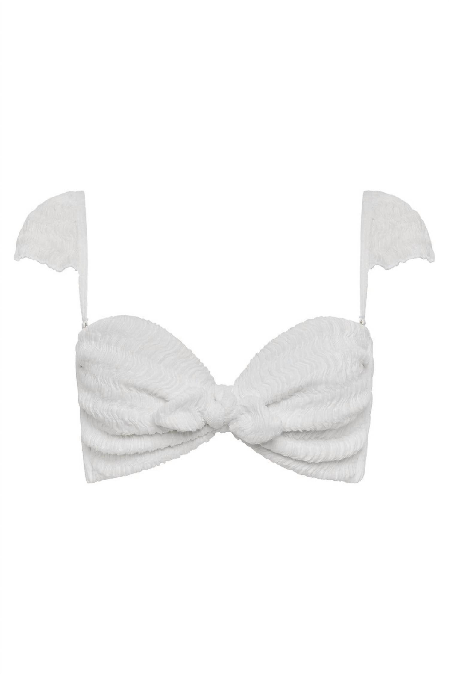 Ideal for relaxed poolside moments, this adorable swimsuit effortlessly transitions into the perfect sunset dinner outfit when paired with a flowing skirt. Introducing the Montce Cabana Bikini Top in Seychelles, a chic swimwear piece designed for a stylish summer. This bandeau-style top offers medium support with adjustable, removable cap sleeves, a flattering sweetheart neckline, and side-seam boning for added support. The composition is 55% Turkish Cotton, 40% Polyester, and 5% Spandex to ensure durability and comfort. Featuring an adjustable self-tie closure and ruched and pleated detailing, this bikini top is perfect for beach days. Care: Hand wash to maintain the integrity of the delicate fabric.
