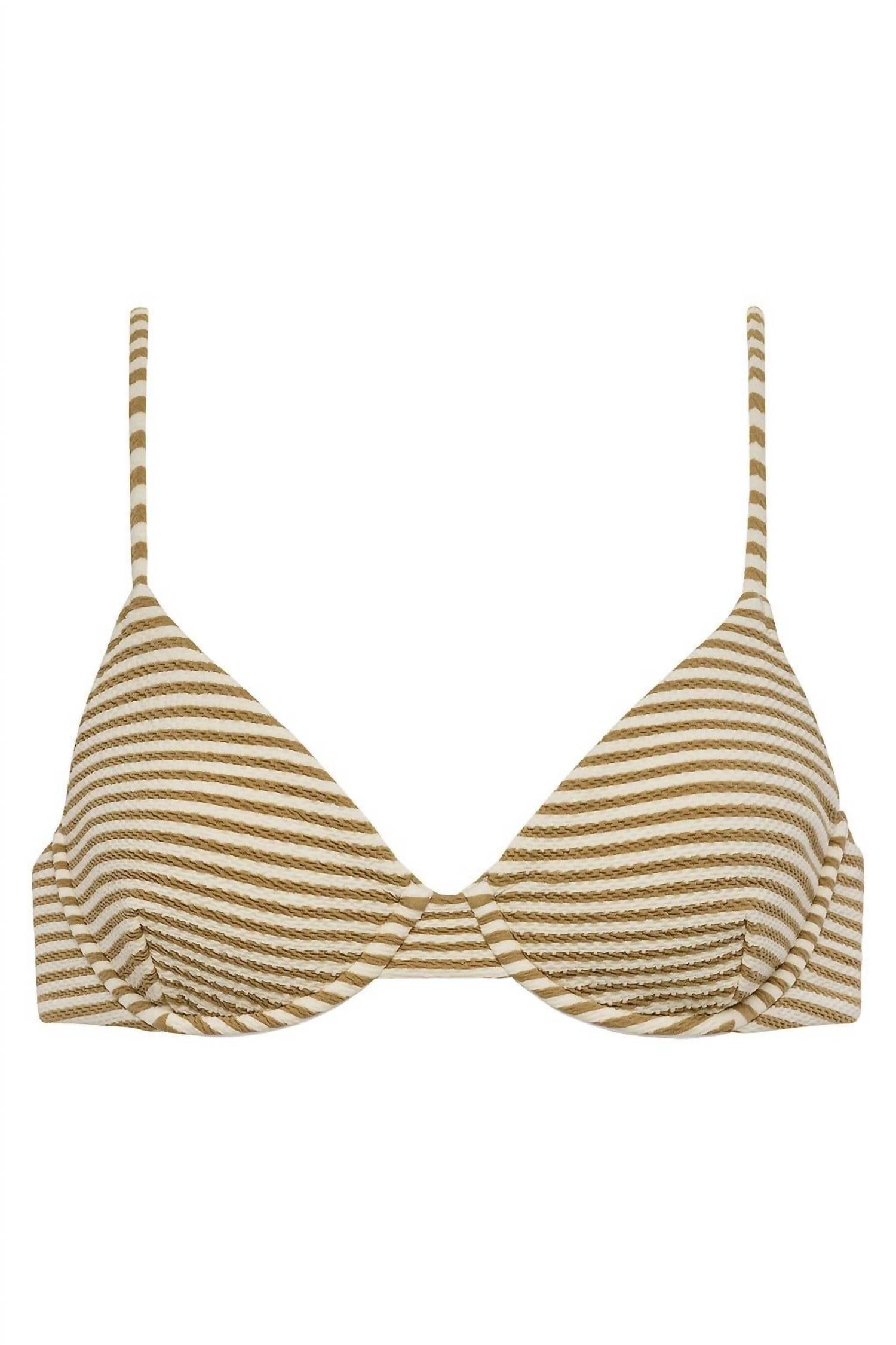 This cute and flattering swimsuit is perfect for making a splash at the pool, lounging on sun-kissed beaches, and staying stylish throughout the upcoming summer season. The Montce Dainty Underwire Bikini Top is a perfect blend of style and support for your summer beach days. Featuring a demi cup design, this swim top offers medium to high support with an underwire structure and adjustable shoulder straps. Crafted from a 90% Nylon and 10% Spandex blend, the tan and beige striped fabric provides a minimalistic look with a flattering scoop neckline and princess dart detailing. Made in Spain with OEKO-TEX certification, it ensures quality and comfort. Closure: Adjustable back hook. Care: Hand wash. Ideal for achieving minimal tan lines while ensuring chic elegance.