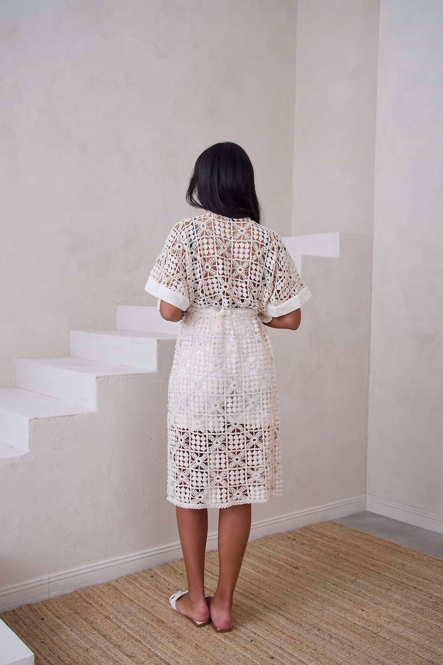 You're going to want to pack this for your next vacation! Introducing the Saachi V-neck Tie-front Crochet Cover Up in a chic white hue, perfect for your beach-to-brunch transitions. This long, textured kimono is crafted from 100% cotton, featuring a playful mix of floral and geometric crochet patterns. Its braided tie-front closure beautifully cinches the waist, while the split hem ensures a fluid movement. Care for this minimalist summer essential with a simple hand wash.