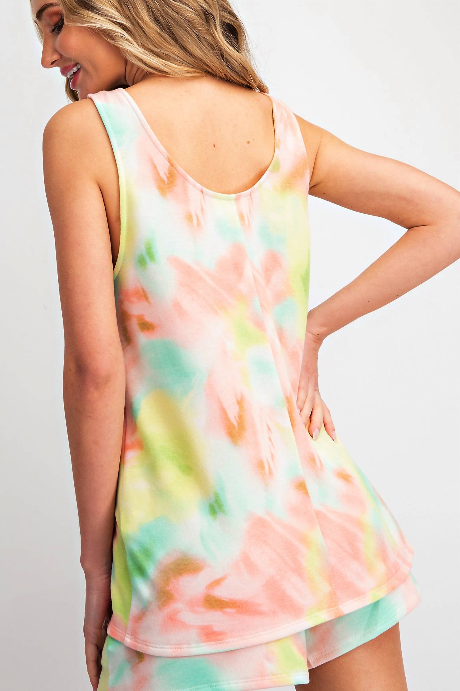 Fit, fabric and functionality. This tank top checks all the boxes. Introducing the Tie Dye Tank Top by 143 STORY, a vivid addition to your summer wardrobe. With a sleeveless design and a playful scoop neckline, this top features a draped front pocket and vibrant tie-dye print in peach, lemon, and lime hues. Composition: 63% Polyester, 34% Rayon, 3% Spandex. Made in the USA, this top features a pull-on closure with care instructions to hand wash cold. Available in sizes with the following measurements: Small (Bust 38", Length 26"), Medium (Bust 40", Length 27"), and Large (Bust 42", Length 28"). Perfect for weekends or beach days, pair it with matching shorts or your favorite jeans.