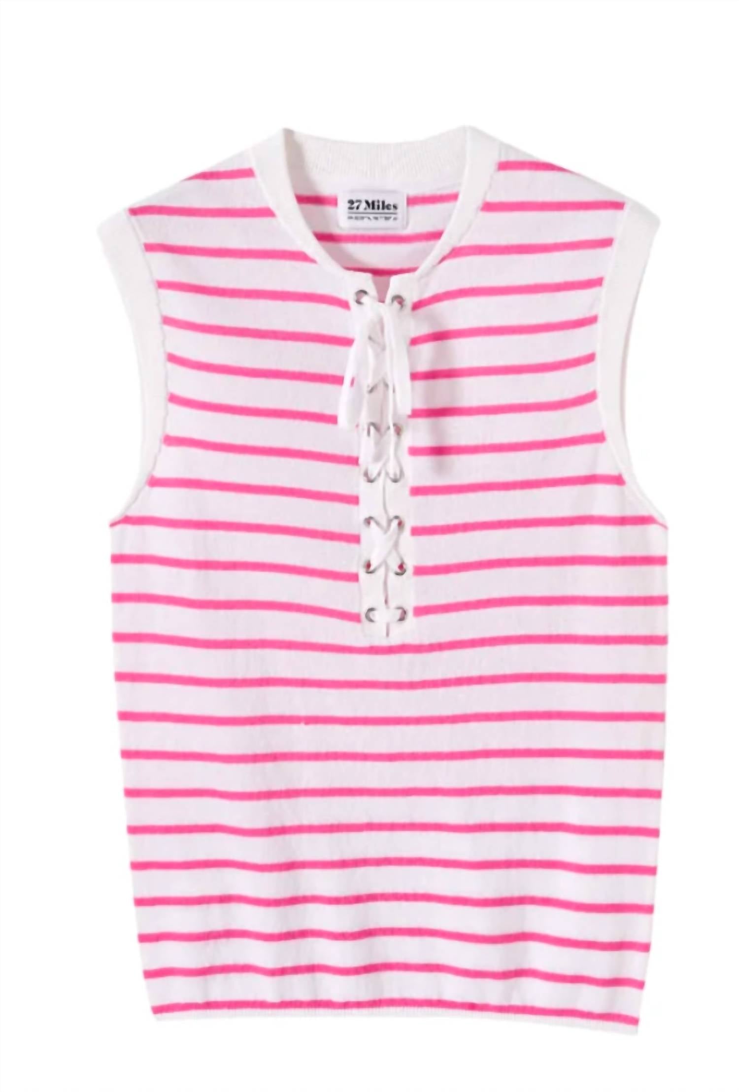 This a white fitted lace-up tank with bright pink stripes. Lightweight feel and perfect to pair with your favorite white denim shorts or jeans.