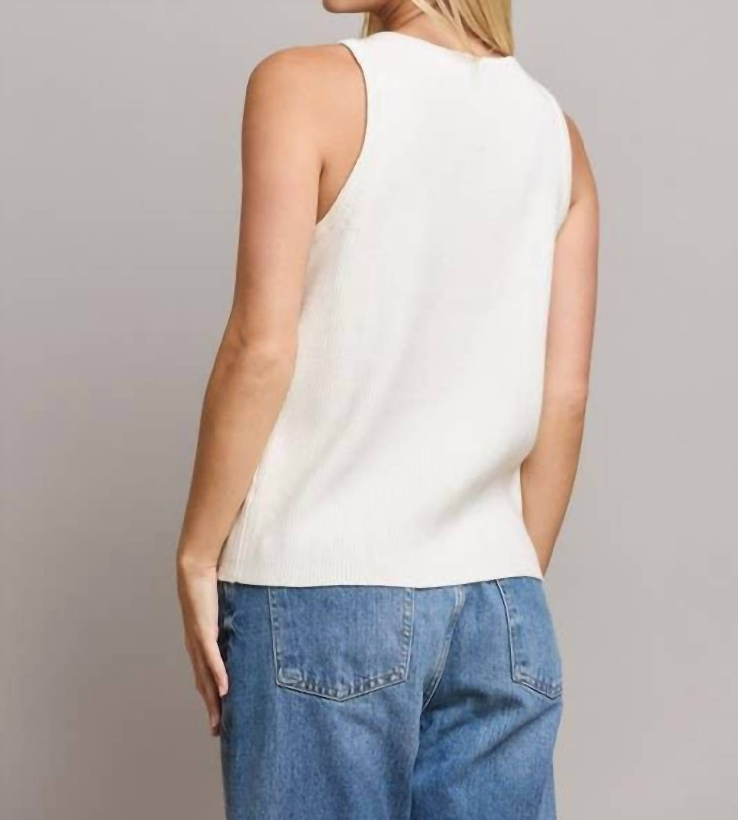 The perfect tank top for those warmer weather seasons. Introducing the Sequin Sleeveless Top by ABLE, an essential layering piece in a luxurious ivory knit. This tank is designed with a crewneck and flaunts a textured pattern, offering both style and comfort. Made for breathability with a substantial feel, it's perfect for transitioning into cooler seasons.