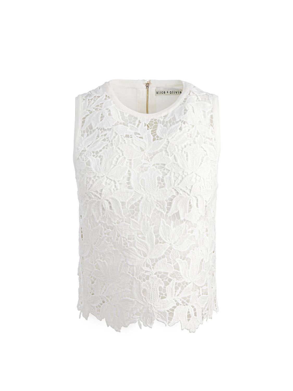 Unveil your bold femininity with the Danielle Lace Front Sweater Tank by alice + olivia in Off White, a piece that masterfully balances delicate allure and polished sophistication. This sleeveless tank combines an intricate lace front with a solid knit back, completed with a sleek back zipper closure. Crafted from an 84% viscose, 15% nylon, and 1% elastane blend, this 20-inch long tank offers both comfort and style. Care for this imported piece with dry cleaning only. Model is 5'10" and wearing a size XS.