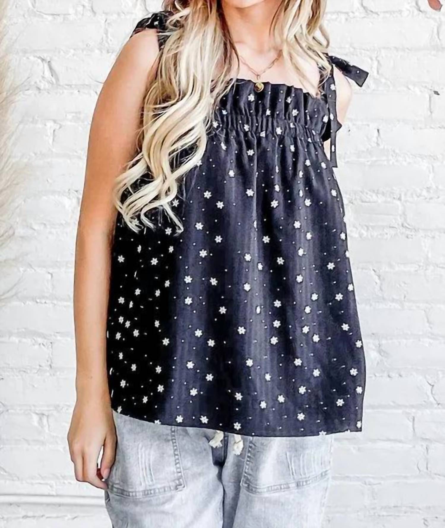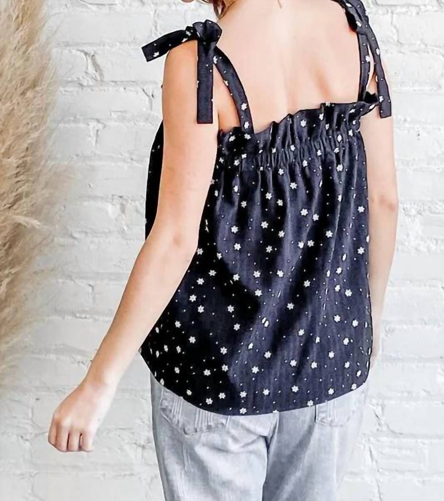This classic tank top is perfect for layering and cute enough to wear on its own. Embrace the playful spirit of the '90s with the Daisy Polka Dot Print Ruffle Tank Top by And The Why, available in classic white. This sleeveless top features a charming polka dot pattern and ruffle design, complemented by whimsical ribbon ties for straps. Crafted from polyester, it offers a stylish squareneck that embodies a carefree vacation vibe. Care instructions: Machine wash and tumble dry for easy maintenance.