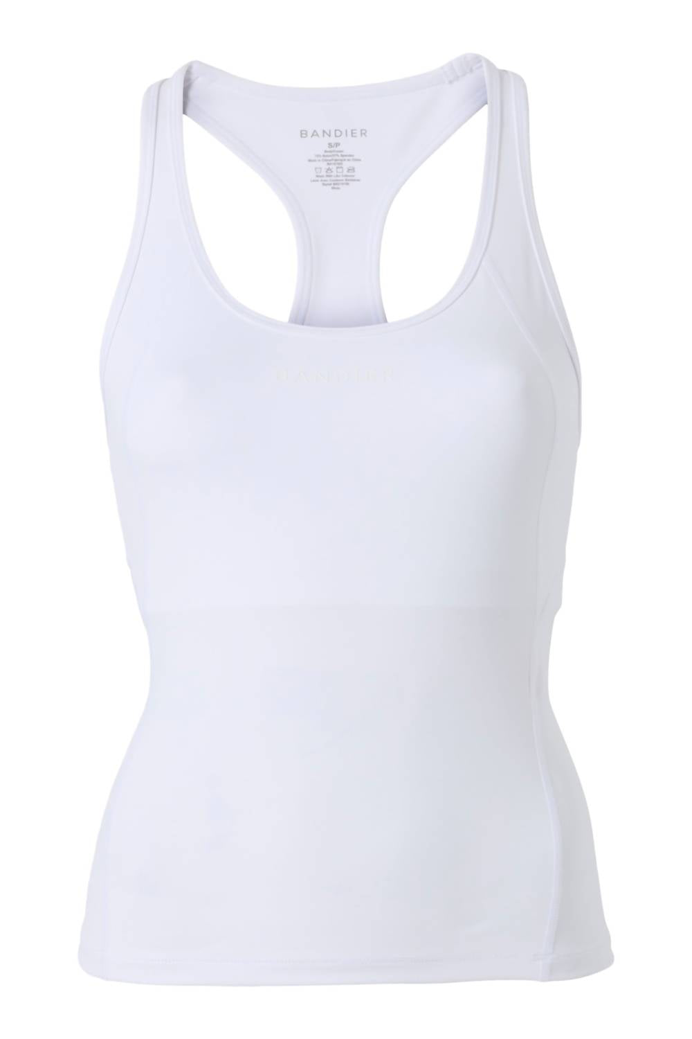 This classic tank top is perfect for layering and cute enough to wear on its own. Elevate your workout wardrobe with the Bandier Center Stage Tank Top, a standout in solid white. This sleeveless, performance tank by BANDIER is crafted from a lightweight, moisture-wicking blend of 73% nylon and 27% spandex, ideal for low-impact activities. Designed with a scoop neckline and a racerback, it features a built-in shelf bra for supreme comfort and support, and the pull-on closure ensures ease of wear. Made for summer athleisure and fitness routines, it is machine washable for hassle-free care.