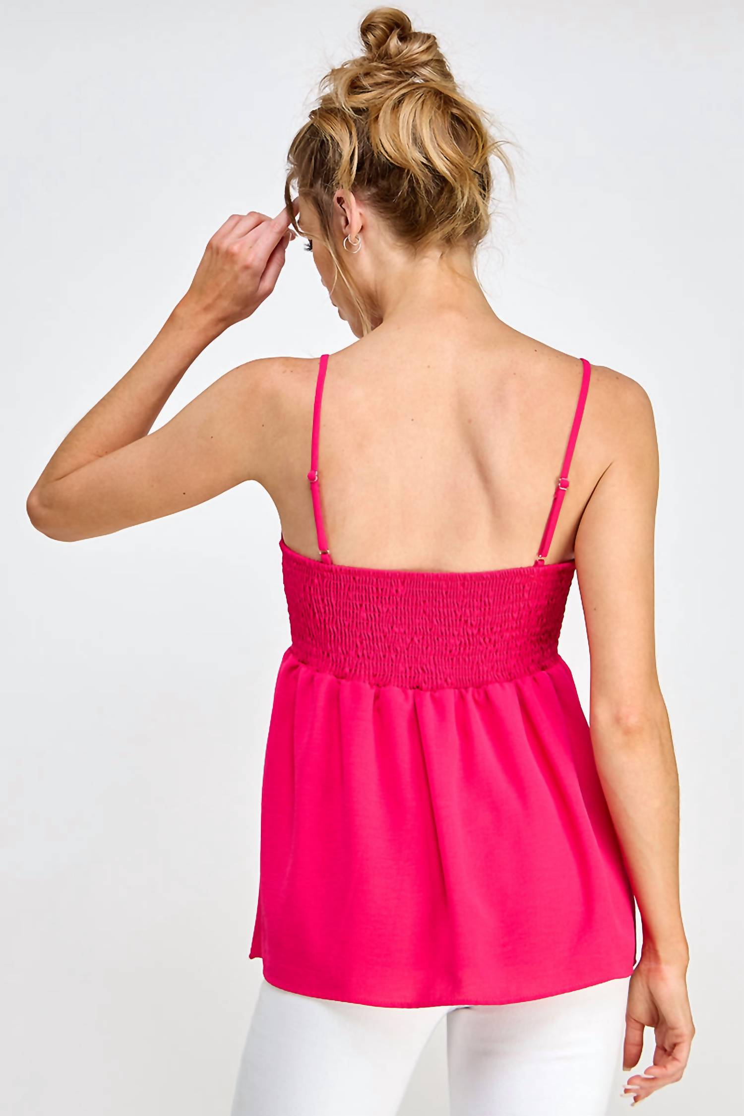 The perfect tank top for those warmer weather seasons. Discover the Esmerelda Baby Doll Tank from Carmela, a charming addition to your wardrobe in rich magenta shades for winter. This women’s tank features adjustable spaghetti straps, a double V neckline, and a smocked back, complemented by a baby doll style for a flattering fit. Crafted from 100% polyester, this floral-patterned piece is fully lined for extra comfort. With a convenient pull-on closure, it’s easy to care for with machine wash instructions.