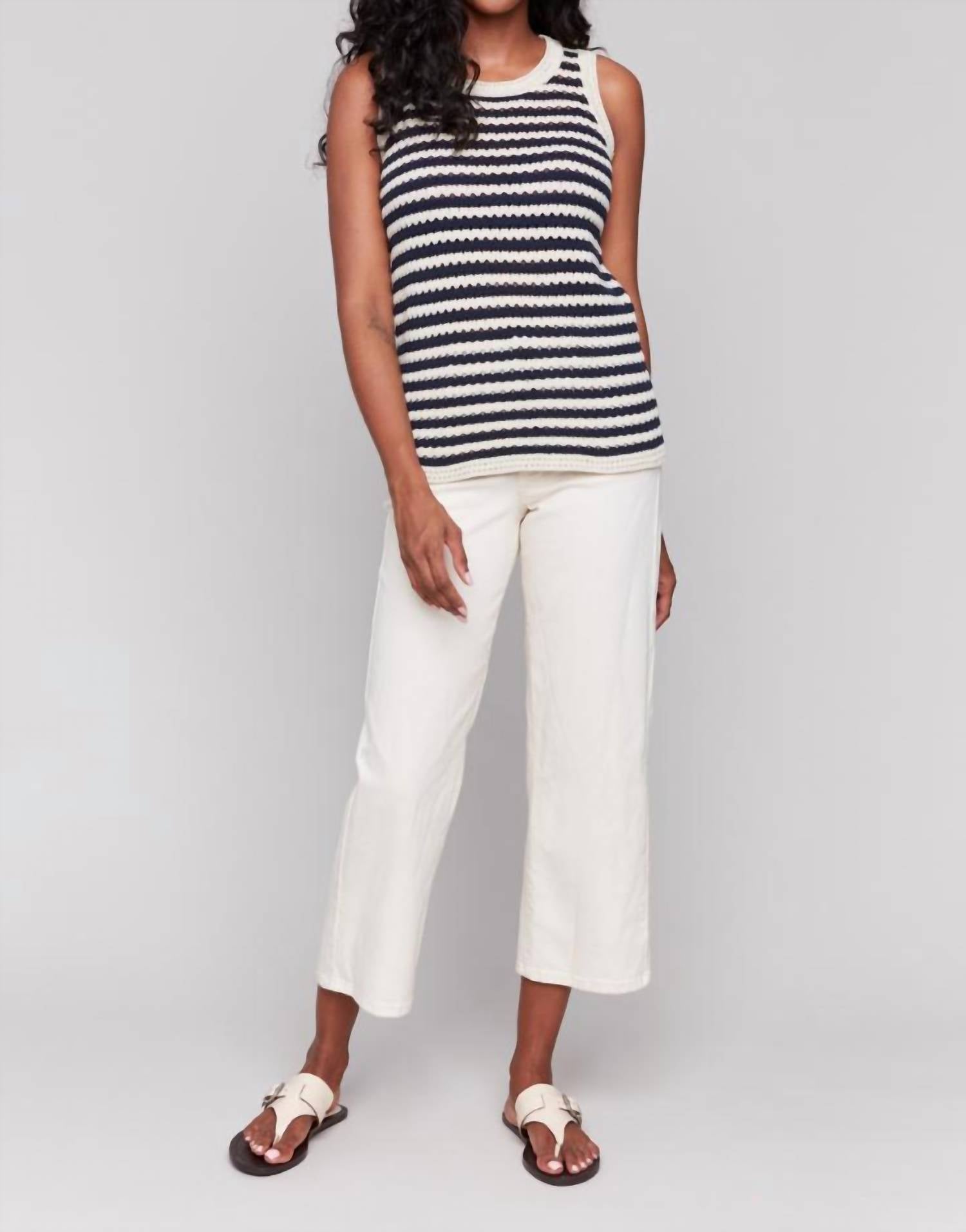 This classic tank top is perfect for layering and cute enough to wear on its own. Introducing the Arlene Crewneck Sweater by CHARLIE B, a stylish addition to your wardrobe in a classic black and white stripe. This sleeveless sweater, made from 100% cotton, features a crew neck and a textured pattern, perfect for layering or wearing solo. Originating from an unspecified location, it offers a convenient pull-on closure. Care for this sweater is simple: machine wash in cold water on a delicate cycle, lay flat to dry, and iron on low if needed.