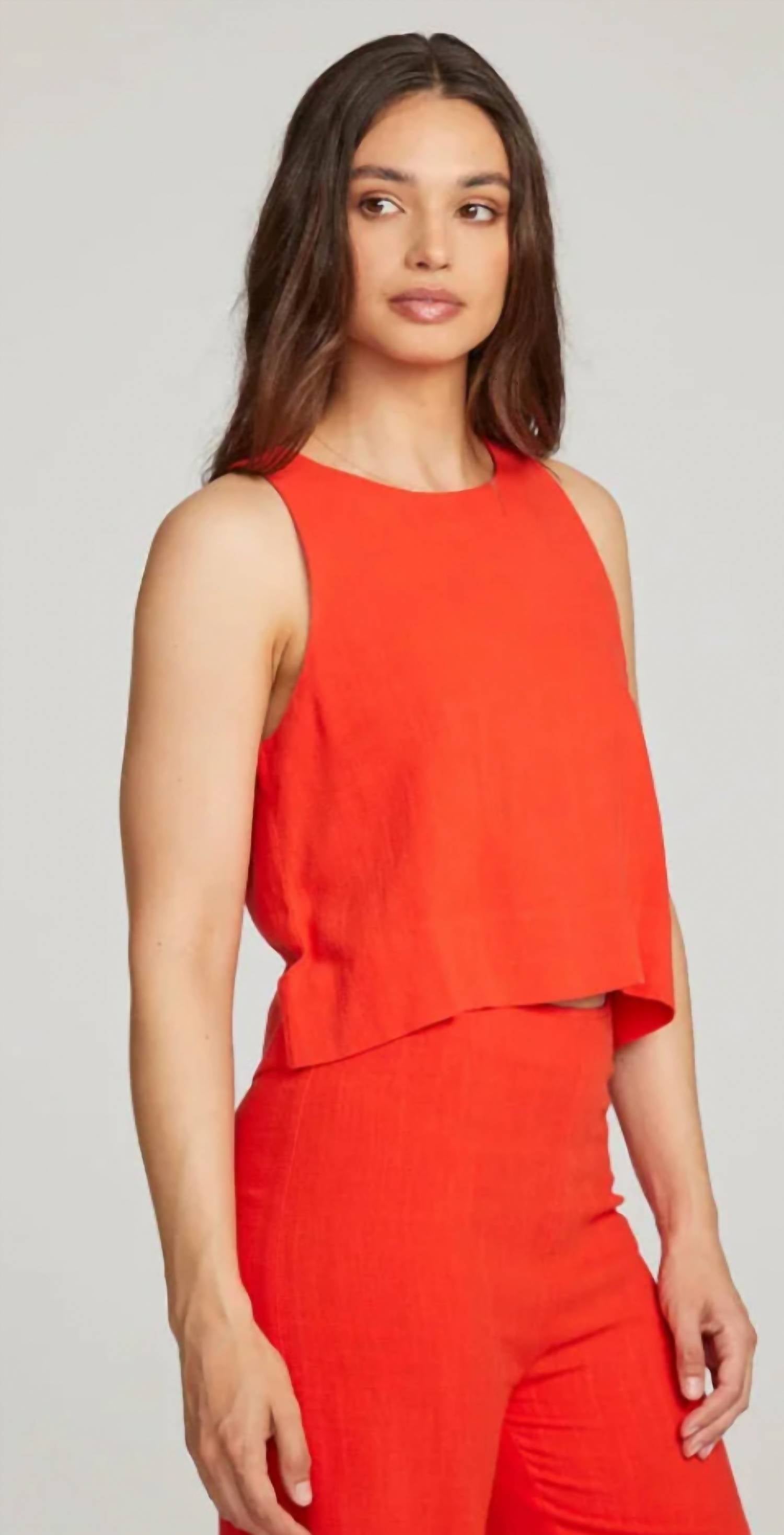 Fit, fabric and functionality. This tank top checks all the boxes. Look sharp this spring in the Riley Tank in flame. Elevate your office wardrobe with this tank. It's a great layering piece with a blazer for work meetings or worn alone to get together with friends after hours. Style with Lurex Boucle Shorts in Flame (sold separately). Model is 5'9" and wearing size small. Fabric Content: 80% Rayon 20% Linen