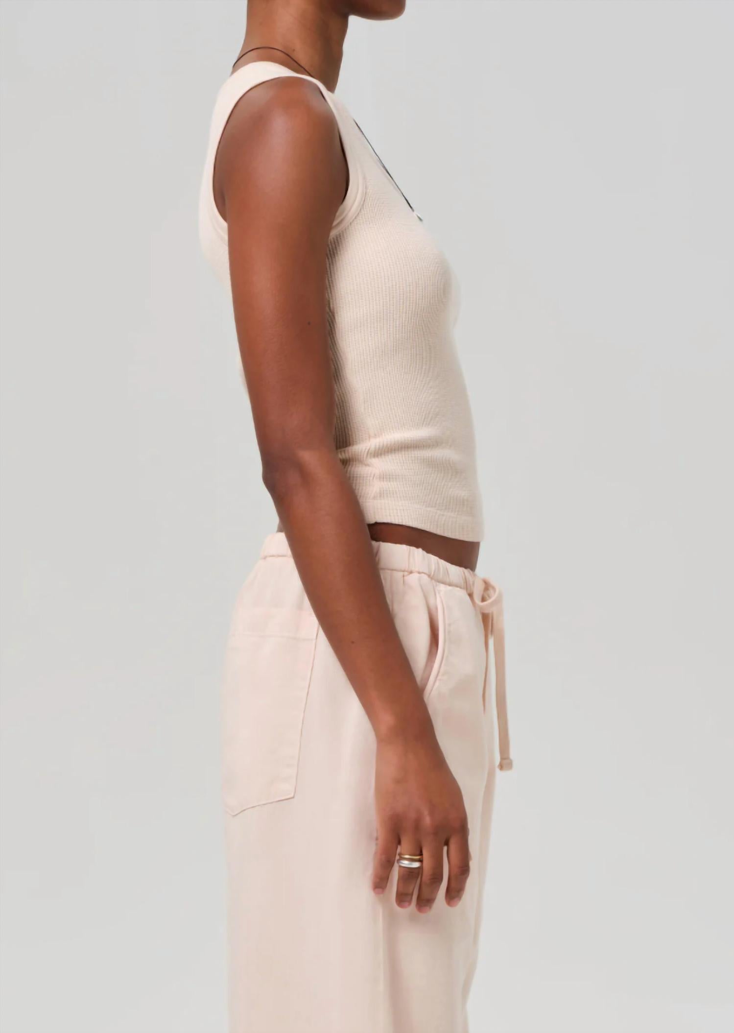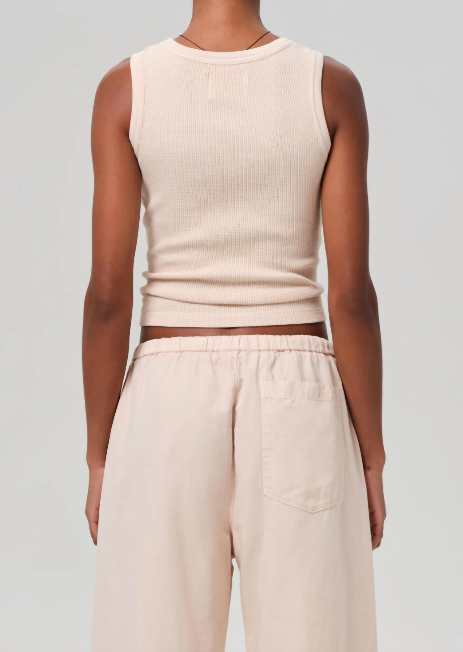 Fit, fabric and functionality. This tank top checks all the boxes. Elevate your summer wardrobe with the Inez Waffle Tank by Citizens of Humanity, a minimalist piece in a unique shrimp hue. This sleeveless tank is crafted from 100% cotton in a soft, stretchy waffle rib fabric, ensuring comfort and style. Its scoop neck design makes it ideal for layering or wearing alone, perfectly complementing any casual or camping outfit. Enjoy the ease of a pull-on closure, with care instructions to machine wash for hassle-free maintenance. Model is 5'10" and wearing a size small.