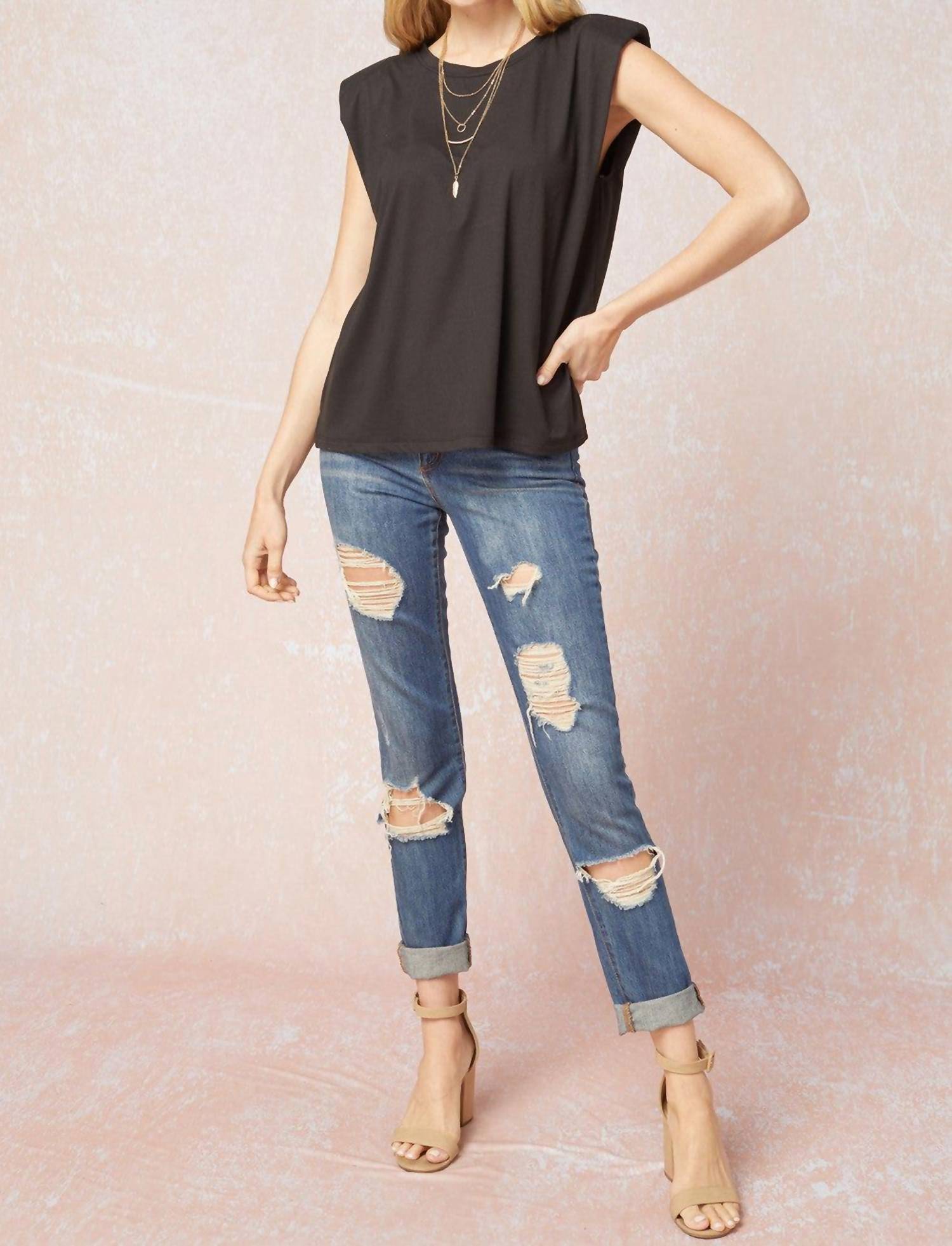 The perfect tank top for those warmer weather seasons. Elevate your wardrobe with the Solid Shoulder Pad Top by Entro, a chic piece perfect for travel and minimalist style. This sleeveless top features a crewneck and trendy shoulder pads, complemented by a muscle tank style and an A-line silhouette. Made from a blend of 96% Polyester and 4% Spandex, it offers a lightweight and stretchy fit. Proudly made in the USA with a pull-on closure and recommended to be hand washed or dry cleaned, this top comes in Small, Medium, and Large, with a consistent length of 24 inches.