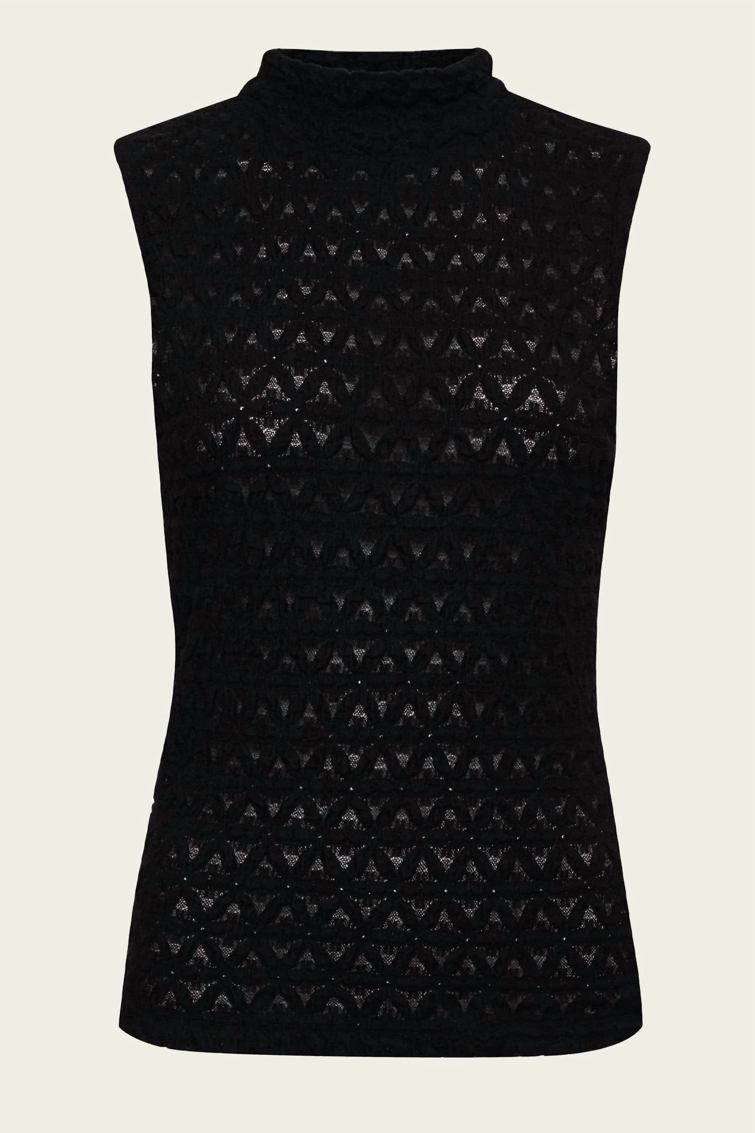 Introducing the Puckered Lace Sleeveless Mockneck Top by Enza Costa, a stylish piece perfect for your next music festival. This top is sleeveless and features a flattering turtleneck in a midweight, textured lace fabric. The composition includes 77% cotton, 19% nylon, and 4% lycra, ensuring comfort and subtle stretch. Crafted in the USA, it offers a semi-sheer finish with a sophisticated back button loop closure. Care for this elegant black top with a simple hand wash.