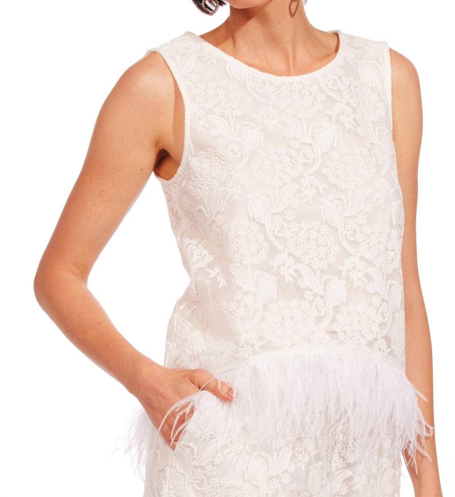 Adorned with embroidered flowers and feather trim, it features a relaxed fit, round neck, and sleeveless design. Crafted from polyester, it offers versatile styling options whether worn as a set with the matching Gianna Pant or paired separately.