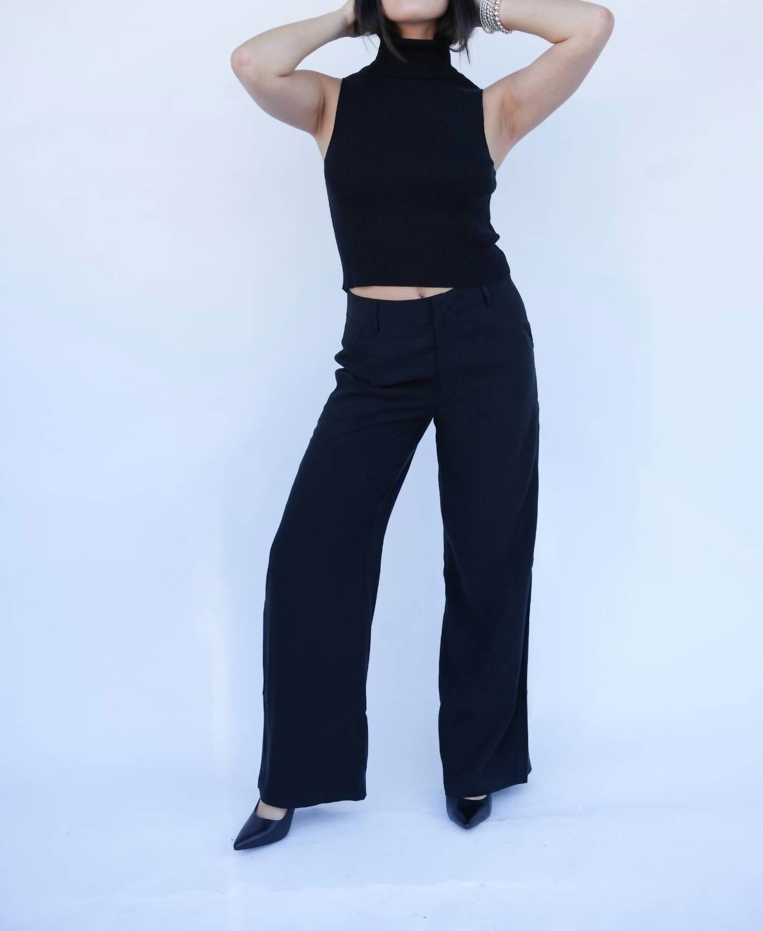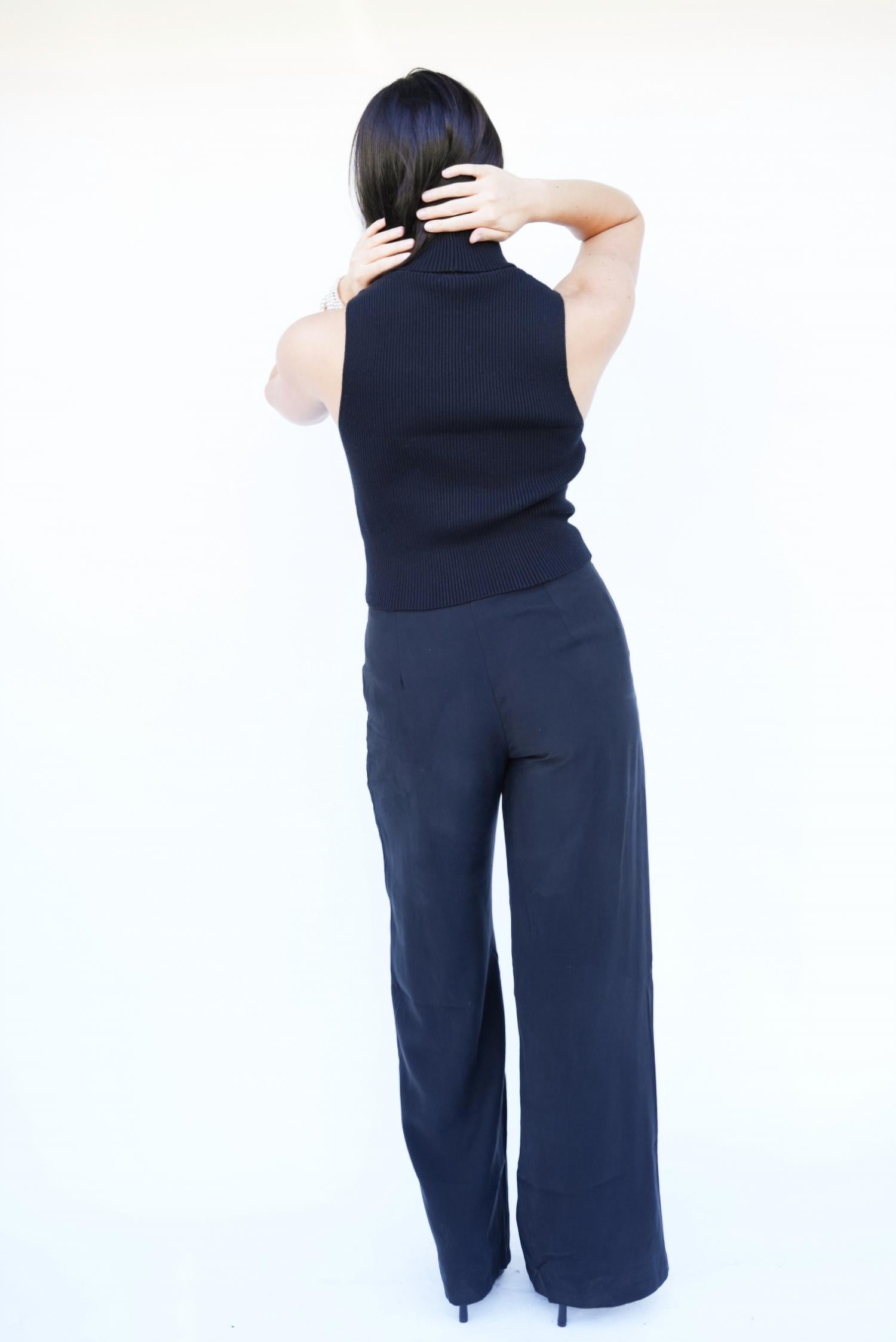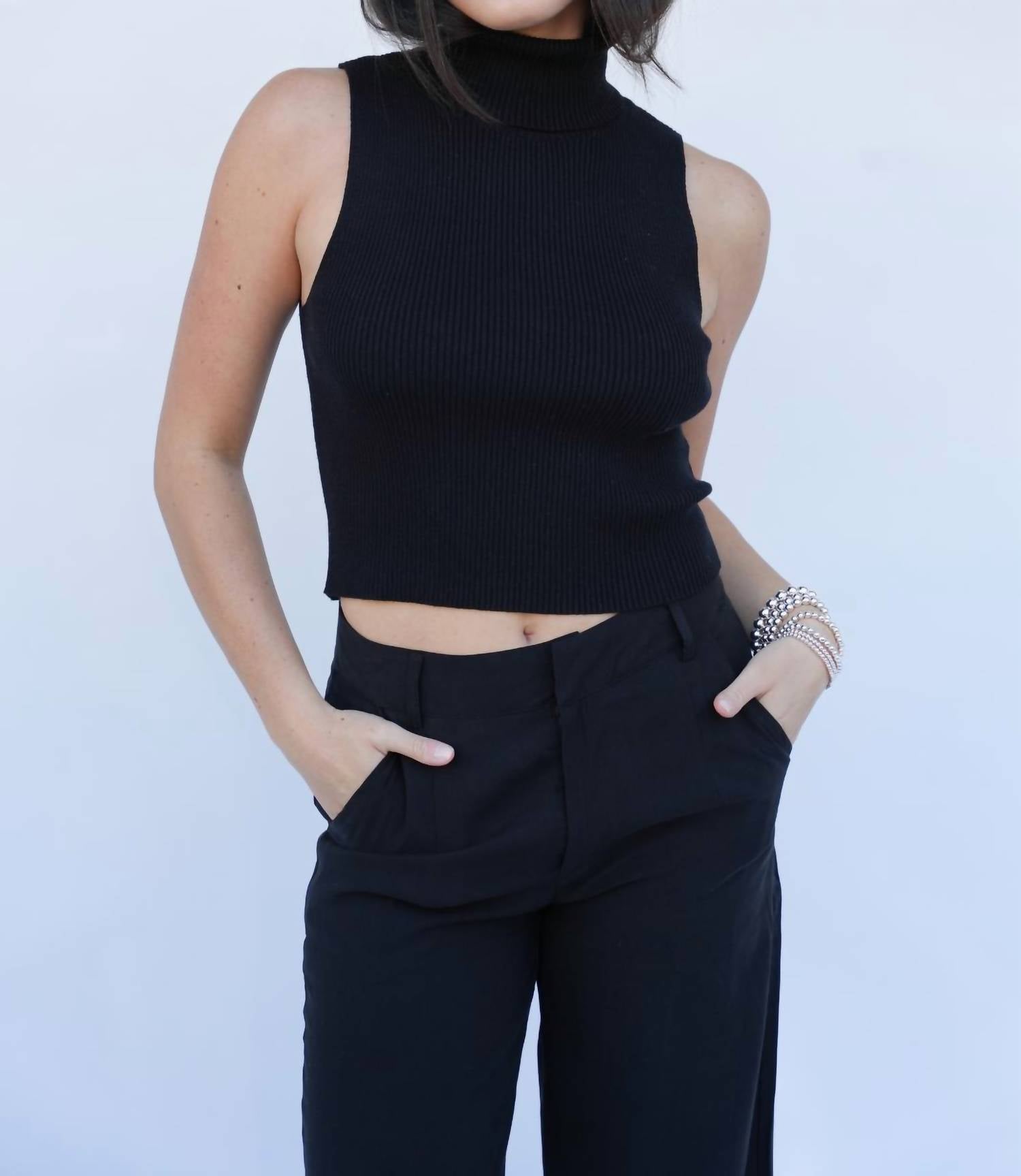 This classic tank top is perfect for layering and cute enough to wear on its own. Introducing the Wells Sleeveless Turtleneck Top by Falcon Park, a chic addition to your fall wardrobe in classic black. This chic turtleneck is sleeveless, making it perfect for layering, and it features a knit fabrication crafted from 100% cotton for a cozy feel. With a pull-on closure, this minimalist tank top effortlessly transitions from office attire to cocktail party chic. The model is showcasing a size small, with measurements of 5'8" height, 31" bust, 26" waist, and 36.5" hip.