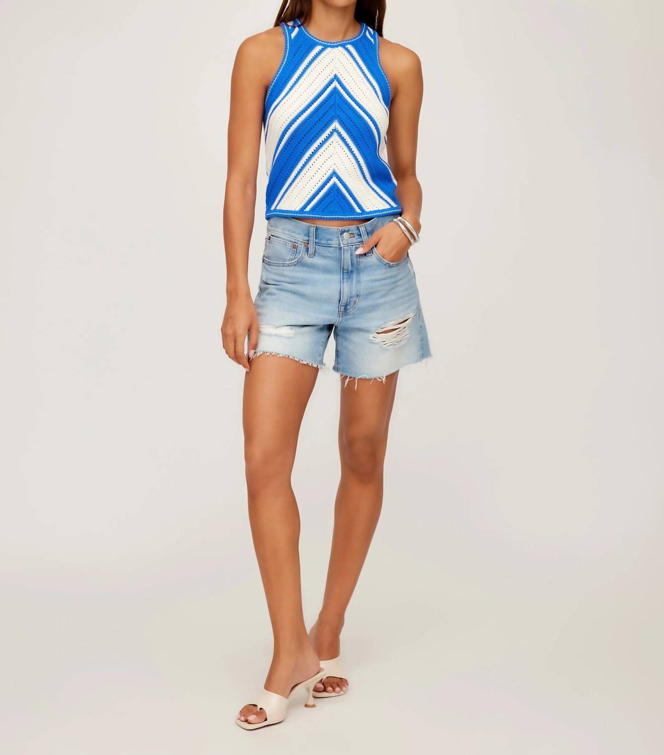 Elevate your wardrobe with the Alice Crochet Tank by Fifteen Twenty, a versatile sleeveless essential in a stunning blue hue. This tank features a crew neck and form-fitting design with a unique crochet chevron pattern and wide stitch detail. Made from quality materials, it's a pull-on style that's perfect for transitioning from laid-back to luxe occasions. Enhance your summer vacation style with this chic tank, ideal for pairing with high-waisted shorts or the Amber Crochet Skirt.