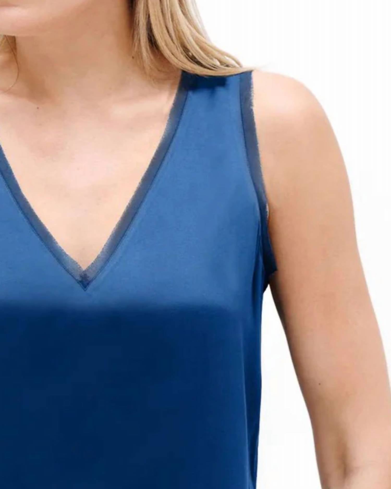 Fit, fabric and functionality. This tank top checks all the boxes. Experience the luxurious comfort of the V-tee Redux Top by Go by Go Silk, available in a serene cielo shade. Designed for an easy fit, this sleeveless tank features a V-neck with raw edge silk georgette trim, giving it a chic finish. Crafted from buttery soft 100% silk charmeuse, this top measures 24 inches in length for a streamlined look. It offers the convenience of a pull-on closure and is machine washable for effortless care.
