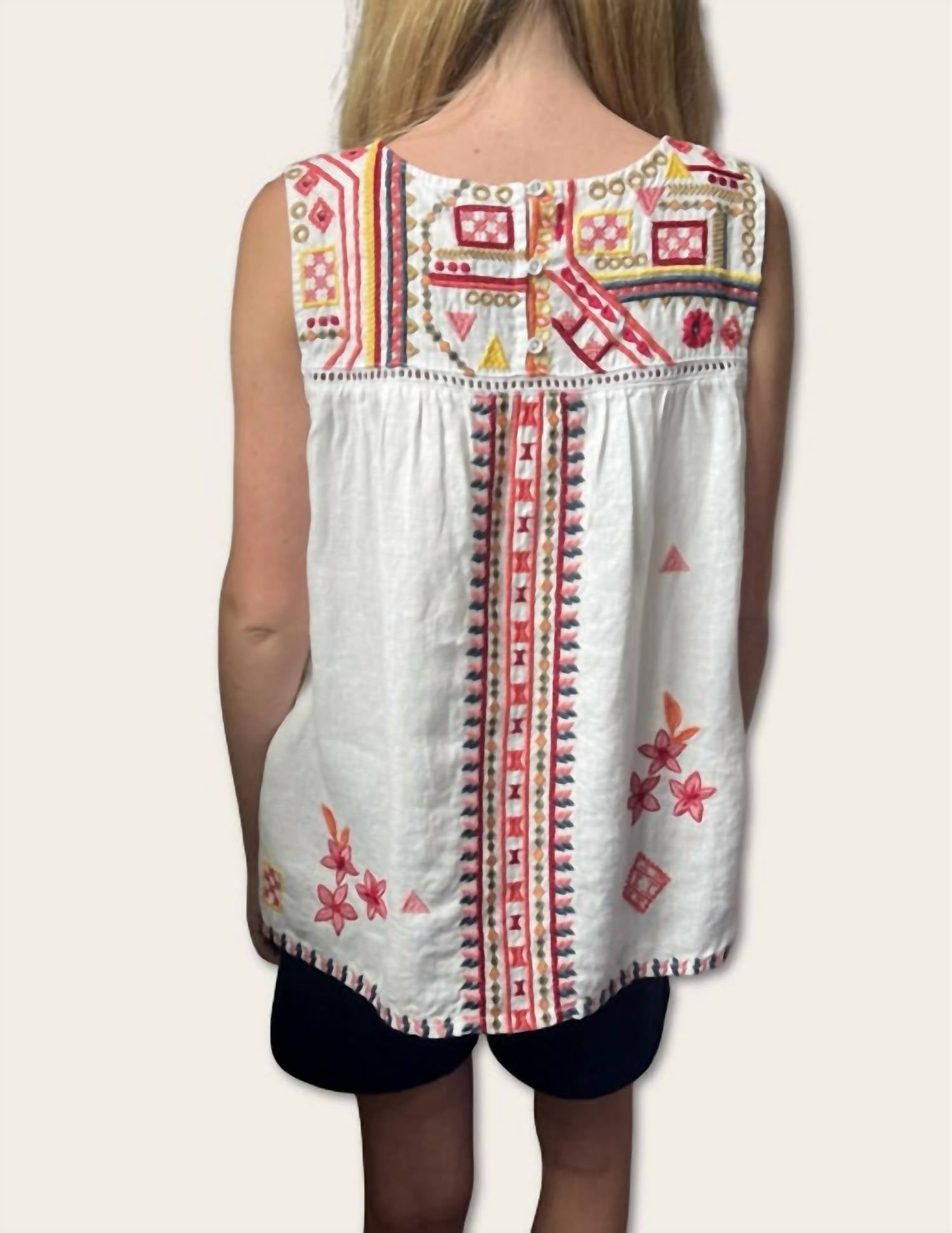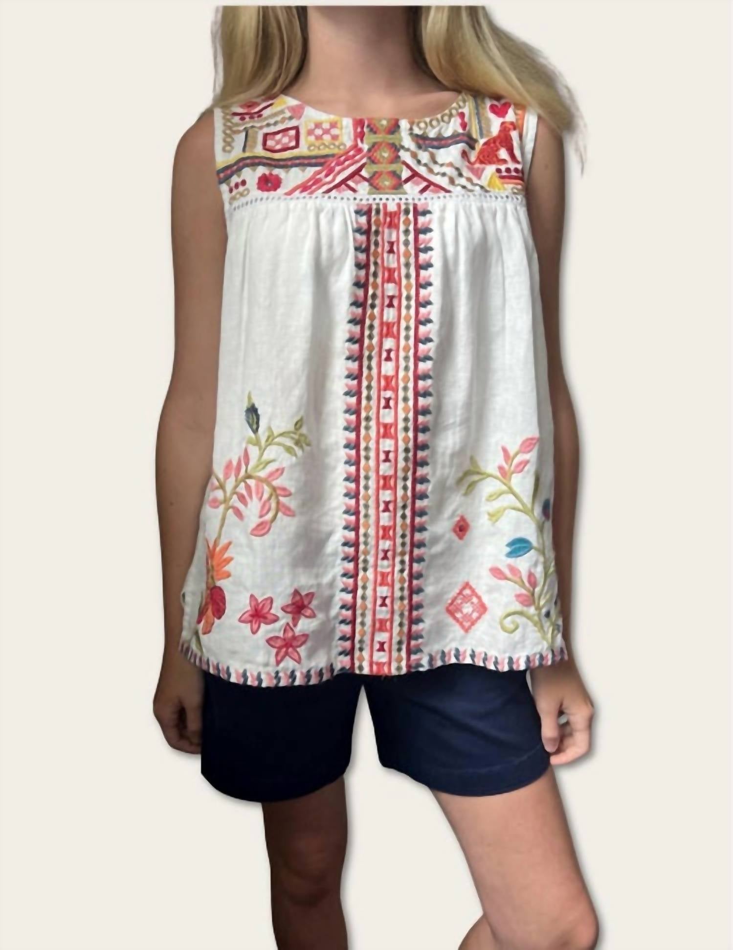 Crafted from 100% breathable linen, the Georgia Relaxed Tank features embroidered floral and geo design exemplified in intricate placement. Featuring a high neck and back, this breezy tank is finished with a boxy split hemline. Model is wearing size XS
