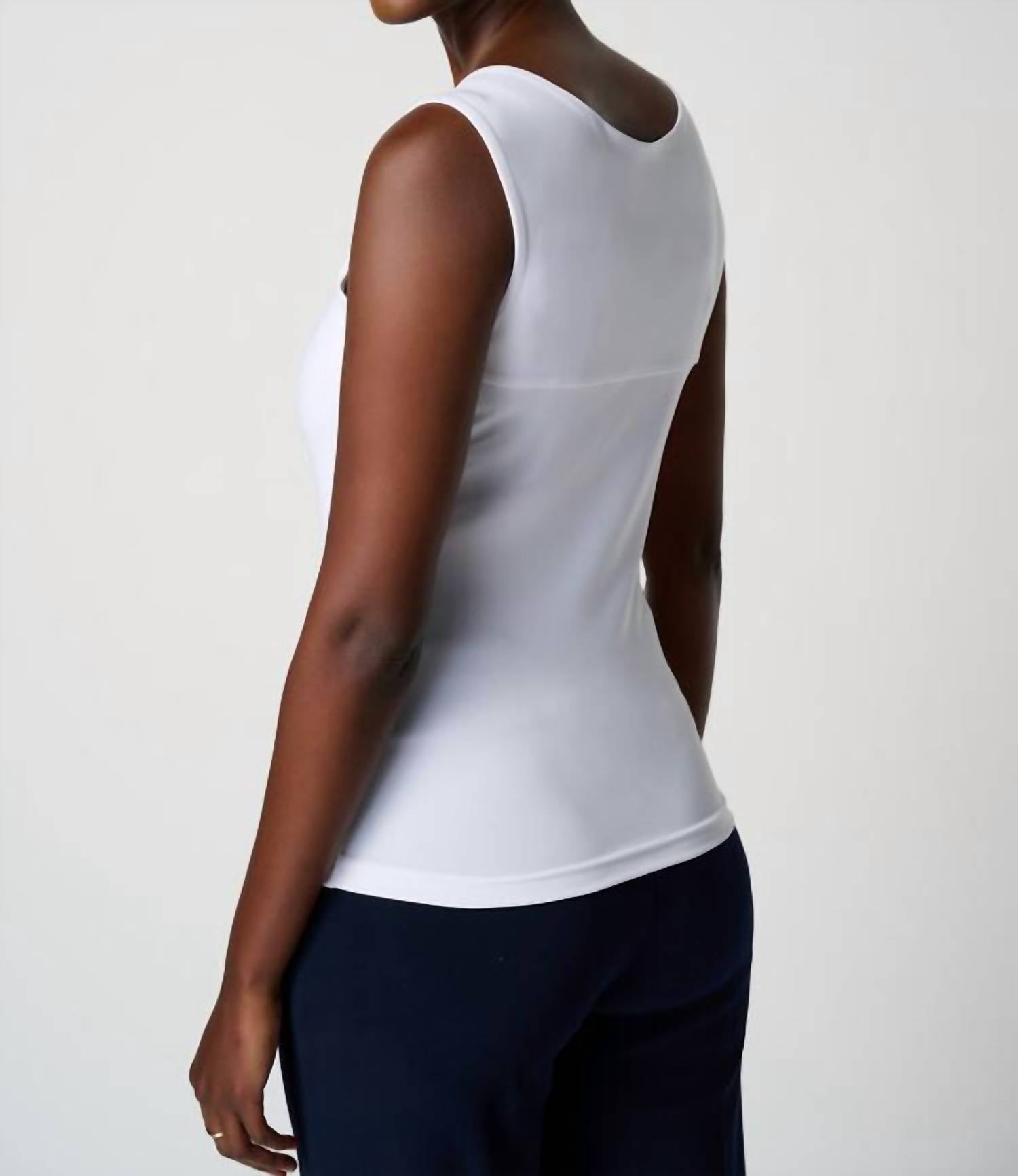 The perfect tank top for those warmer weather seasons. Discover the perfect blend of casual and chic with this Joseph Ribkoff pullover. Designed with a fitted silhouette and hip-length cut, it features a stylish square neckline and a sleeveless design that makes it ideal for summer occasions. The plain pattern and versatile style ensure it effortlessly enhances your wardrobe with both comfort and elegance. Fabric: Silky Knit 96% Polyester, 4% Spandex No pockets No zipper Unlined Our model is 5'9"/175 cm and wears a size 6. Approximate length (size 12): 25" - 64 cm MADE IN CANADA