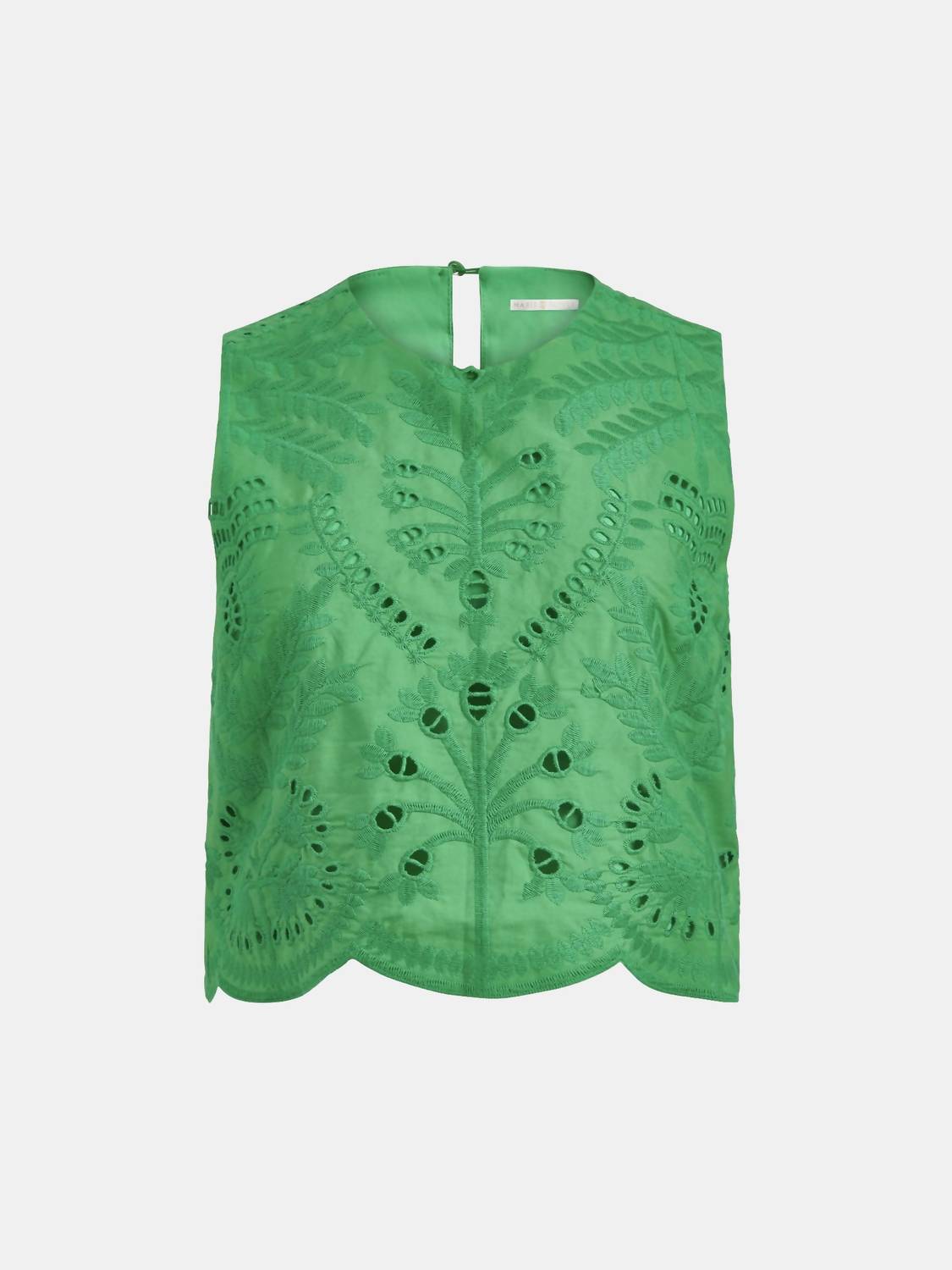 The Marie Oliver Davis Shell Top is an elegant sleeveless crop top crafted in 100% cotton, adorned with all-over floral embroidery and a delicate scalloped hem for added charm. This emerald piece features a crewneck, making it a stylish addition to any summer wardrobe. Care for this lovely top by hand washing with a gentle detergent and laying flat to dry. Perfectly fitting true to size, it's tailored to ensure you look chic and sophisticated with every wear.