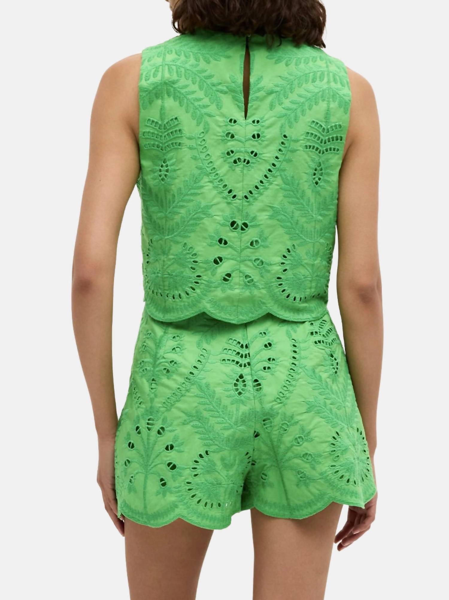 The perfect tank top for those warmer weather seasons. The Marie Oliver Davis Shell Top is an elegant sleeveless crop top crafted in 100% cotton, adorned with all-over floral embroidery and a delicate scalloped hem for added charm. This emerald piece features a crewneck, making it a stylish addition to any summer wardrobe. Care for this lovely top by hand washing with a gentle detergent and laying flat to dry. Perfectly fitting true to size, it's tailored to ensure you look chic and sophisticated with every wear.