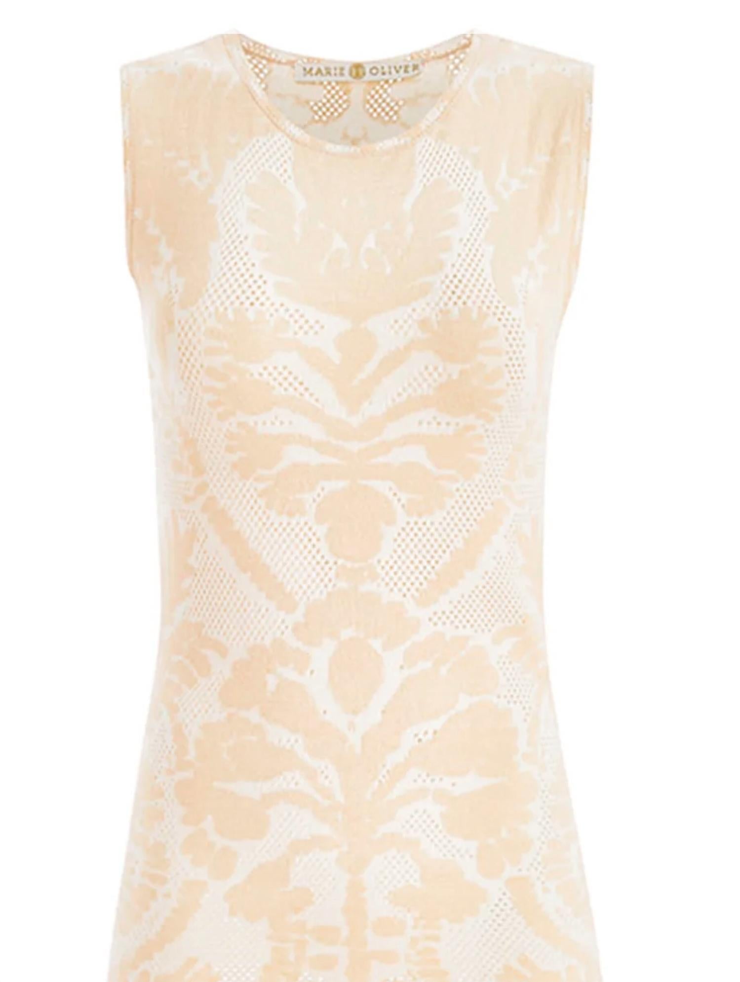 Elevate your summer wardrobe with the Melba Jacquard Knit Tank Top by Marie Oliver, crafted in a textured jacquard mesh knit with a striking damask pattern. This sleeveless, fitted shell tank top features a classic crewneck and is made from a luxurious blend of 78% viscose and 22% polyamide. Designed in an opal hue, it offers a pull-on closure for easy wear. Perfect for vacation, this chic piece is unlined for a breezy feel.