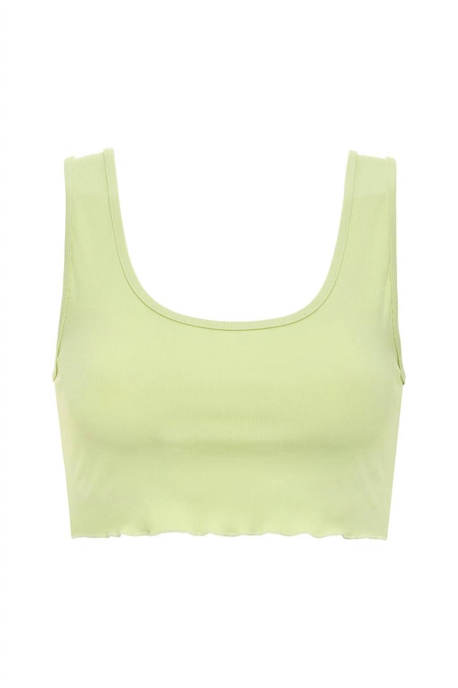 This classic tank top is perfect for layering and cute enough to wear on its own. Embrace the essence of summer with Montce's Avo Micro Rib Binded Tank Top, perfect for minimalist styling on vacation or celebrating St. Patrick's Day. This sleeveless comfort fit crop top, featuring a scoopneck and wavy marrow bottom hem, is crafted from a recycled polyester spandex blend in a solid avocado cotton color. It offers both a stylish and eco-friendly option for the modern woman. Closure is via an effortless pull-on method, with care instructions to hand wash as needed.